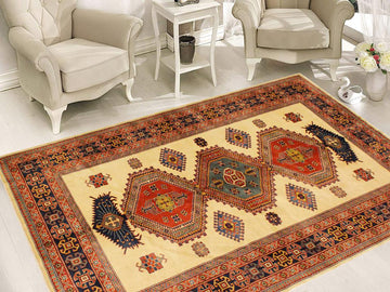 Embellish your home with this exquisitely hand-knotted Super Kazak Rug made with the finest hand spun wool and all vegetable dyes. Demonstrating incredible attention to detail, this hand-knotted masterpiece features an intricate Super Kazak pattern in a classic color palette....