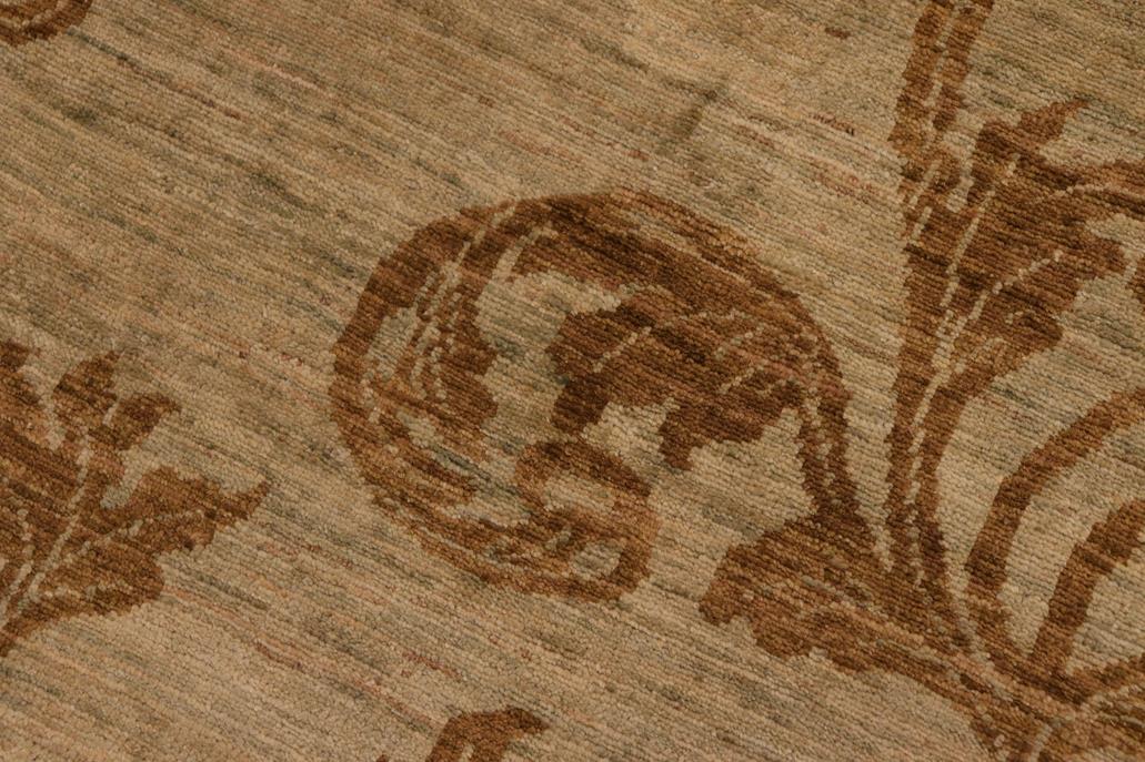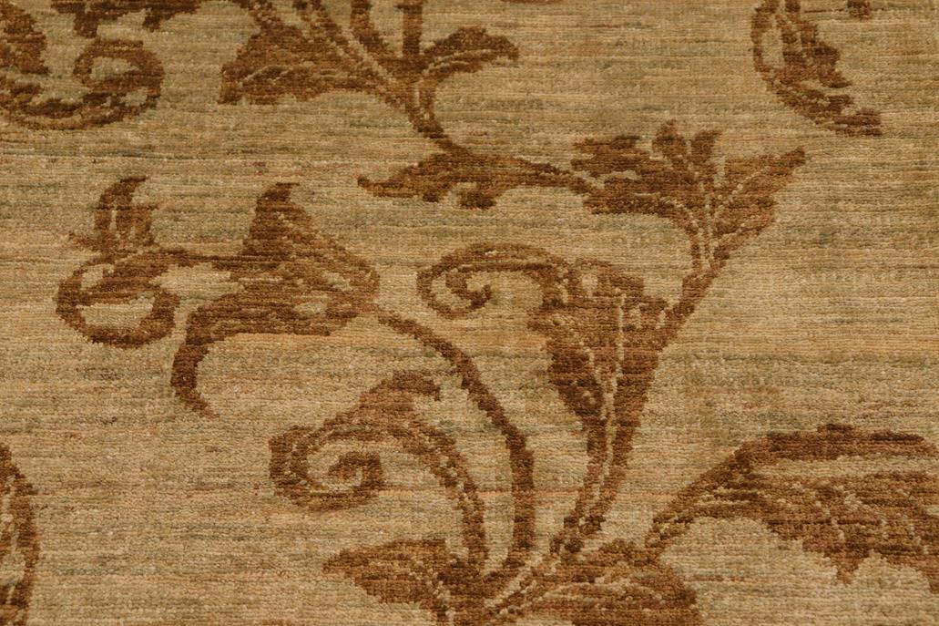 Enhance the ambiance of your home with this magnificent Persian-influenced Turkish hand-knotted rug made by skilled artisans capable of creating the most exceptional vegetable dyes and hand-spun wool. This exquisite handmade rug is a one-of-a-kind Peshawar Kafkaz, otherwise identified as Chobi, Chobi Peshawar, Oushak, or Ziegler rug. These handmade rugs are crafted in Pakistan utilizing superior-quality wool imported from Australia, New Zealand, and Korea in two types of weaves: the Persian weave and the Mori weave. This rug is meticulously crafted by hand using the finest natural vegetable dyes extracted from local plants. The artisans use a blend of hand-spun local and fine merino wool, resulting in a rug with a compelling texture, higher lanolin content, and longer staple. The artisans occasionally incorporate natural or artificial silk into the pile to enhance specific motifs. The finished product is an awe-inspiring flawless design execution and an understated palette that exudes elegance. Contemporary Peshawar rugs draw inspiration from antique Persian designs and feature modern design motifs with vibrant color tones. Hand-knotted with all-natural dyes, resulting in a unique abrash effect and subtle color variations in the pile. Peshawar rugs are known for their stunning and vibrant colors, which were achieved through a process inspired by antique methods. The rug's pile is meticulously trimmed to a moderate thickness and then stone-washed and sun-dried, resulting in a natural sheen and pleasing color tones. Transform the ambiance of your room into a luxurious haven with this gorgeous rug featuring a beautiful color palette. This stunning rug features an intricate oriental design that showcases royalty and seamlessly complements any decor. Its hand-knotted construction and natural fibers provide a soft and comfortable feel underfoot, making it the perfect addition to any room.