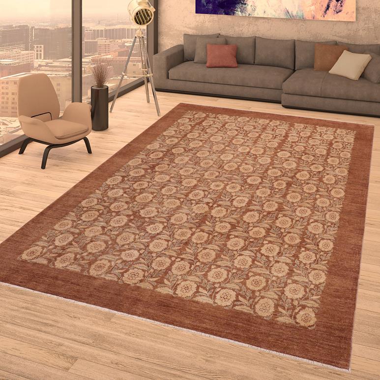Enhance the ambiance of your home with this magnificent Persian-influenced Turkish hand-knotted rug made by skilled artisans capable of creating the most exceptional vegetable dyes and hand-spun wool. This exquisite handmade rug is a one-of-a-kind Peshawar Kafkaz, otherwise identified as Chobi, Chobi Peshawar, Oushak, or Ziegler rug. These handmade rugs are crafted in Pakistan utilizing superior-quality wool imported from Australia, New Zealand, and Korea in two types of weaves: the Persian weave and the Mori weave. This rug is meticulously crafted by hand using the finest natural vegetable dyes extracted from local plants. The artisans use a blend of hand-spun local and fine merino wool, resulting in a rug with a compelling texture, higher lanolin content, and longer staple. The artisans occasionally incorporate natural or artificial silk into the pile to enhance specific motifs. The finished product is an awe-inspiring flawless design execution and an understated palette that exudes elegance. Contemporary Peshawar rugs draw inspiration from antique Persian designs and feature modern design motifs with vibrant color tones. Hand-knotted with all-natural dyes, resulting in a unique abrash effect and subtle color variations in the pile. Peshawar rugs are known for their stunning and vibrant colors, which were achieved through a process inspired by antique methods. The rug's pile is meticulously trimmed to a moderate thickness and then stone-washed and sun-dried, resulting in a natural sheen and pleasing color tones. Transform the ambiance of your room into a luxurious haven with this gorgeous rug featuring a beautiful color palette. This stunning rug features an intricate oriental design that showcases royalty and seamlessly complements any decor. Its hand-knotted construction and natural fibers provide a soft and comfortable feel underfoot, making it the perfect addition to any room.