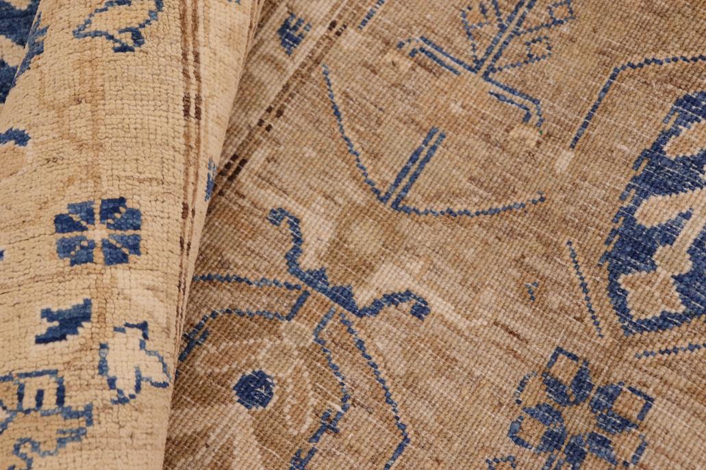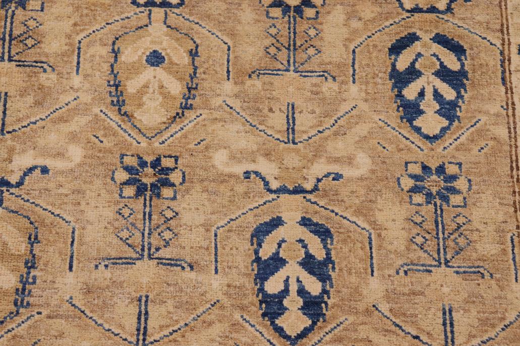 Enhance the ambiance of your home with this magnificent Persian-influenced Turkish hand-knotted rug made by skilled artisans capable of creating the most exceptional vegetable dyes and hand-spun wool. This exquisite handmade rug is a one-of-a-kind Peshawar Kafkaz, otherwise identified as Chobi, Chobi Peshawar, Oushak, or Ziegler rug. These handmade rugs are crafted in Pakistan utilizing superior-quality wool imported from Australia, New Zealand, and Korea in two types of weaves: the Persian weave and the Mori weave. This rug is meticulously crafted by hand using the finest natural vegetable dyes extracted from local plants. The artisans use a blend of hand-spun local and fine merino wool, resulting in a rug with a compelling texture, higher lanolin content, and longer staple. The artisans occasionally incorporate natural or artificial silk into the pile to enhance specific motifs. The finished product is an awe-inspiring flawless design execution and an understated palette that exudes elegance. Contemporary Peshawar rugs draw inspiration from antique Persian designs and feature modern design motifs with vibrant color tones. Hand-knotted with all-natural dyes, resulting in a unique abrash effect and subtle color variations in the pile. Peshawar rugs are known for their stunning and vibrant colors, which were achieved through a process inspired by antique methods. The rug's pile is meticulously trimmed to a moderate thickness and then stone-washed and sun-dried, resulting in a natural sheen and pleasing color tones. Transform the ambiance of your room into a luxurious haven with this gorgeous rug featuring a beautiful color palette. This stunning rug features an intricate oriental design that showcases royalty and seamlessly complements any decor. Its hand-knotted construction and natural fibers provide a soft and comfortable feel underfoot, making it the perfect addition to any room.