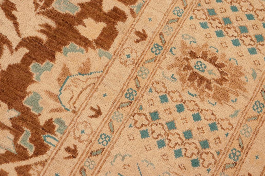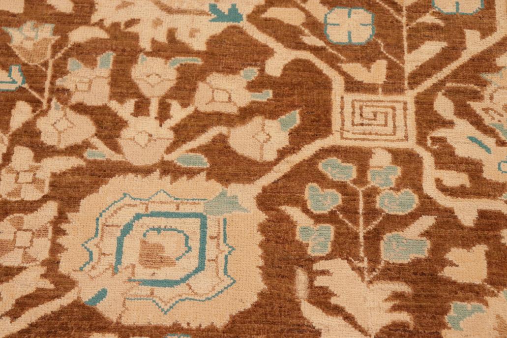 Enhance the ambiance of your home with this magnificent Persian-influenced Turkish hand-knotted rug made by skilled artisans capable of creating the most exceptional vegetable dyes and hand-spun wool. This exquisite handmade rug is a one-of-a-kind Peshawar Kafkaz, otherwise identified as Chobi, Chobi Peshawar, Oushak, or Ziegler rug. These handmade rugs are crafted in Pakistan utilizing superior-quality wool imported from Australia, New Zealand, and Korea in two types of weaves: the Persian weave and the Mori weave. This rug is meticulously crafted by hand using the finest natural vegetable dyes extracted from local plants. The artisans use a blend of hand-spun local and fine merino wool, resulting in a rug with a compelling texture, higher lanolin content, and longer staple. The artisans occasionally incorporate natural or artificial silk into the pile to enhance specific motifs. The finished product is an awe-inspiring flawless design execution and an understated palette that exudes elegance. Contemporary Peshawar rugs draw inspiration from antique Persian designs and feature modern design motifs with vibrant color tones. Hand-knotted with all-natural dyes, resulting in a unique abrash effect and subtle color variations in the pile. Peshawar rugs are known for their stunning and vibrant colors, which were achieved through a process inspired by antique methods. The rug's pile is meticulously trimmed to a moderate thickness and then stone-washed and sun-dried, resulting in a natural sheen and pleasing color tones. Transform the ambiance of your room into a luxurious haven with this gorgeous rug featuring a beautiful color palette. This stunning rug features an intricate oriental design that showcases royalty and seamlessly complements any decor. Its hand-knotted construction and natural fibers provide a soft and comfortable feel underfoot, making it the perfect addition to any room.