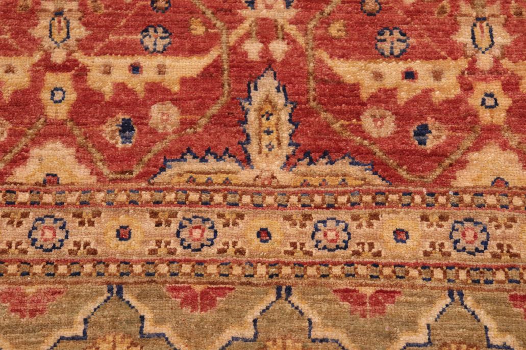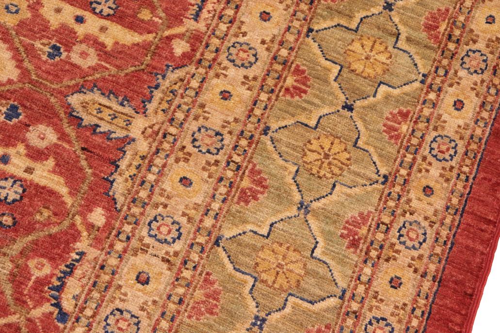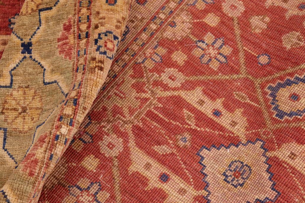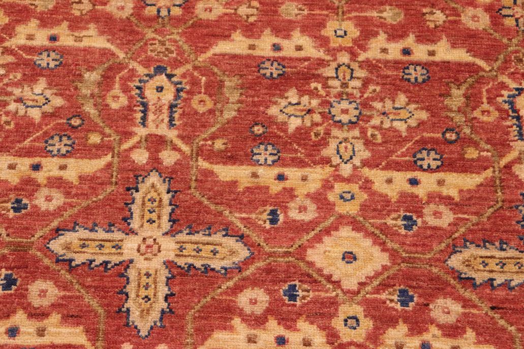 Enhance the ambiance of your home with this magnificent Persian-influenced Turkish hand-knotted rug made by skilled artisans capable of creating the most exceptional vegetable dyes and hand-spun wool. This exquisite handmade rug is a one-of-a-kind Peshawar Kafkaz, otherwise identified as Chobi, Chobi Peshawar, Oushak, or Ziegler rug. These handmade rugs are crafted in Pakistan utilizing superior-quality wool imported from Australia, New Zealand, and Korea in two types of weaves: the Persian weave and the Mori weave. This rug is meticulously crafted by hand using the finest natural vegetable dyes extracted from local plants. The artisans use a blend of hand-spun local and fine merino wool, resulting in a rug with a compelling texture, higher lanolin content, and longer staple. The artisans occasionally incorporate natural or artificial silk into the pile to enhance specific motifs. The finished product is an awe-inspiring flawless design execution and an understated palette that exudes elegance. Contemporary Peshawar rugs draw inspiration from antique Persian designs and feature modern design motifs with vibrant color tones. Hand-knotted with all-natural dyes, resulting in a unique abrash effect and subtle color variations in the pile. Peshawar rugs are known for their stunning and vibrant colors, which were achieved through a process inspired by antique methods. The rug's pile is meticulously trimmed to a moderate thickness and then stone-washed and sun-dried, resulting in a natural sheen and pleasing color tones. Transform the ambiance of your room into a luxurious haven with this gorgeous rug featuring a beautiful color palette. This stunning rug features an intricate oriental design that showcases royalty and seamlessly complements any decor. Its hand-knotted construction and natural fibers provide a soft and comfortable feel underfoot, making it the perfect addition to any room.