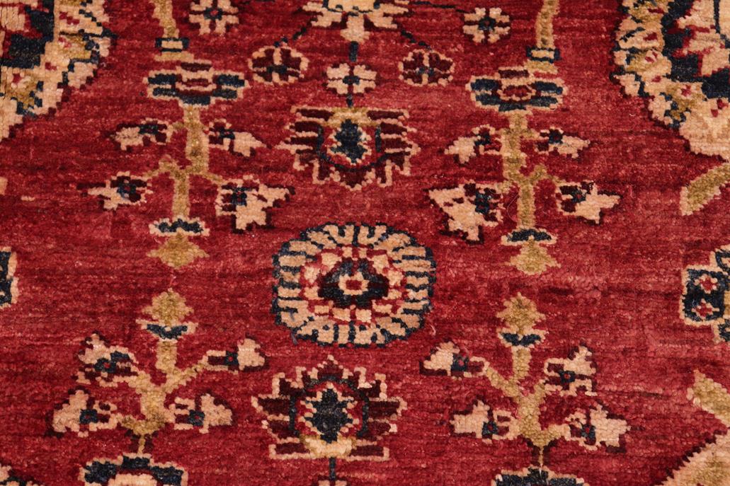 Enhance the ambiance of your home with this magnificent Persian-influenced Turkish hand-knotted rug made by skilled artisans capable of creating the most exceptional vegetable dyes and hand-spun wool. This exquisite handmade rug is a one-of-a-kind Peshawar Kafkaz, otherwise identified as Chobi, Chobi Peshawar, Oushak, or Ziegler rug. These handmade rugs are crafted in Pakistan utilizing superior-quality wool imported from Australia, New Zealand, and Korea in two types of weaves: the Persian weave and the Mori weave. This rug is meticulously crafted by hand using the finest natural vegetable dyes extracted from local plants. The artisans use a blend of hand-spun local and fine merino wool, resulting in a rug with a compelling texture, higher lanolin content, and longer staple. The artisans occasionally incorporate natural or artificial silk into the pile to enhance specific motifs. The finished product is an awe-inspiring flawless design execution and an understated palette that exudes elegance. Contemporary Peshawar rugs draw inspiration from antique Persian designs and feature modern design motifs with vibrant color tones. Hand-knotted with all-natural dyes, resulting in a unique abrash effect and subtle color variations in the pile. Peshawar rugs are known for their stunning and vibrant colors, which were achieved through a process inspired by antique methods. The rug's pile is meticulously trimmed to a moderate thickness and then stone-washed and sun-dried, resulting in a natural sheen and pleasing color tones. Transform the ambiance of your room into a luxurious haven with this gorgeous rug featuring a beautiful color palette. This stunning rug features an intricate oriental design that showcases royalty and seamlessly complements any decor. Its hand-knotted construction and natural fibers provide a soft and comfortable feel underfoot, making it the perfect addition to any room.