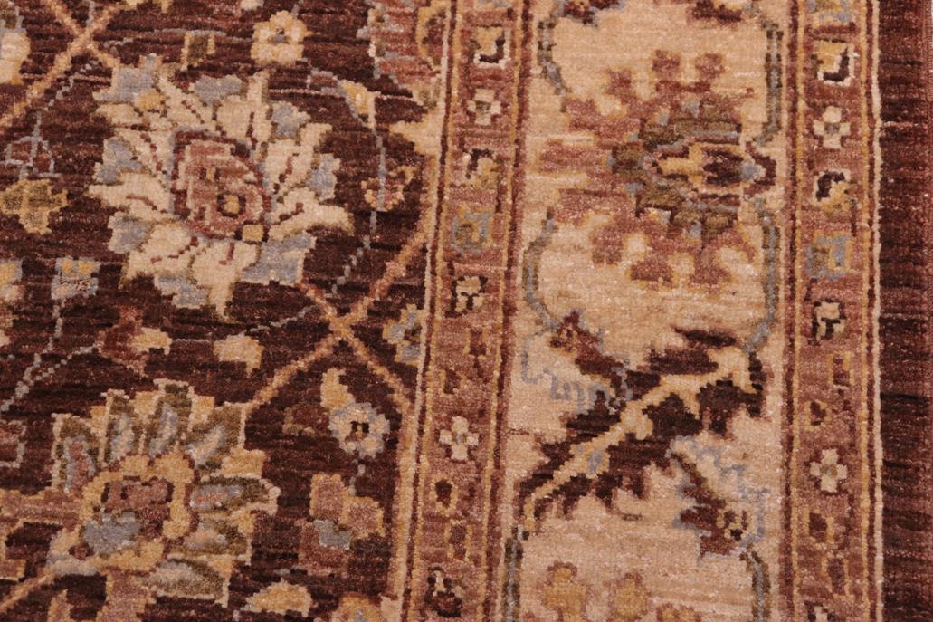 Enhance the ambiance of your home with this magnificent Persian-influenced Turkish hand-knotted rug made by skilled artisans capable of creating the most exceptional vegetable dyes and hand-spun wool. This exquisite handmade rug is a one-of-a-kind Peshawar Kafkaz, otherwise identified as Chobi, Chobi Peshawar, Oushak, or Ziegler rug. These handmade rugs are crafted in Pakistan utilizing superior-quality wool imported from Australia, New Zealand, and Korea in two types of weaves: the Persian weave and the Mori weave. This rug is meticulously crafted by hand using the finest natural vegetable dyes extracted from local plants. The artisans use a blend of hand-spun local and fine merino wool, resulting in a rug with a compelling texture, higher lanolin content, and longer staple. The artisans occasionally incorporate natural or artificial silk into the pile to enhance specific motifs. The finished product is an awe-inspiring flawless design execution and an understated palette that exudes elegance. Contemporary Peshawar rugs draw inspiration from antique Persian designs and feature modern design motifs with vibrant color tones. Hand-knotted with all-natural dyes, resulting in a unique abrash effect and subtle color variations in the pile. Peshawar rugs are known for their stunning and vibrant colors, which were achieved through a process inspired by antique methods. The rug's pile is meticulously trimmed to a moderate thickness and then stone-washed and sun-dried, resulting in a natural sheen and pleasing color tones. Transform the ambiance of your room into a luxurious haven with this gorgeous rug featuring a beautiful color palette. This stunning rug features an intricate oriental design that showcases royalty and seamlessly complements any decor. Its hand-knotted construction and natural fibers provide a soft and comfortable feel underfoot, making it the perfect addition to any room.