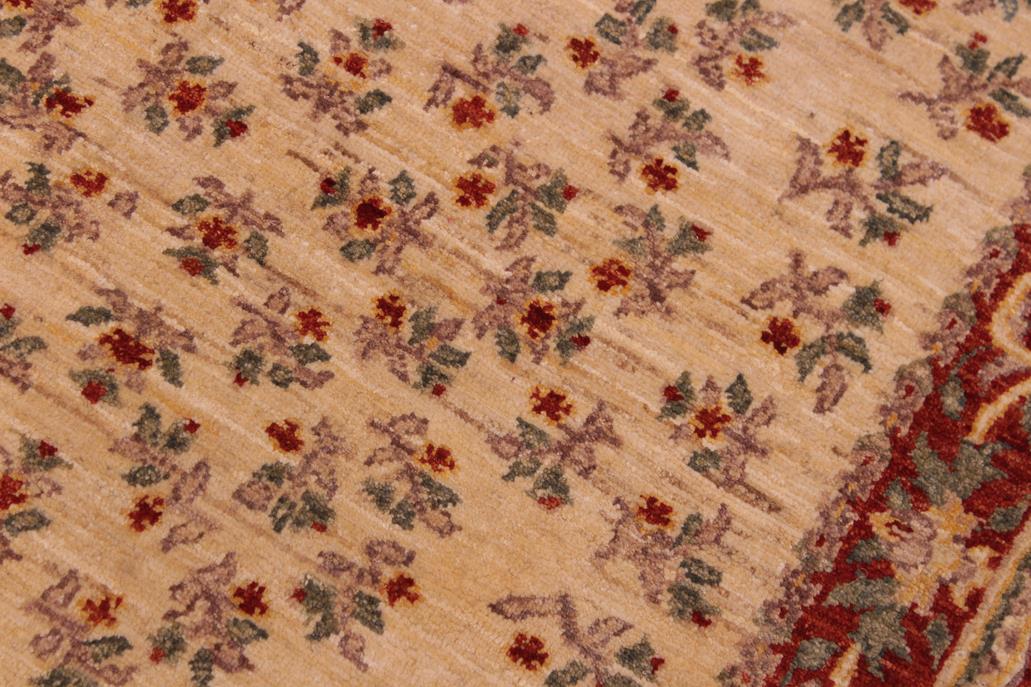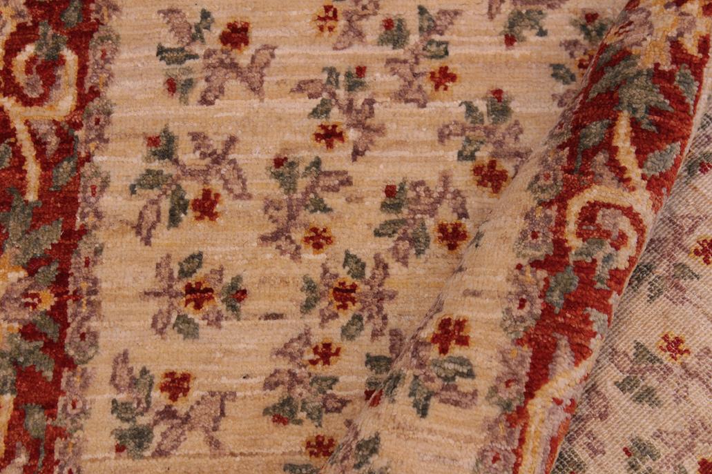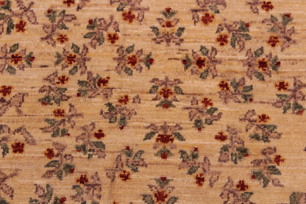 Enhance the ambiance of your home with this magnificent Persian-influenced Turkish hand-knotted rug made by skilled artisans capable of creating the most exceptional vegetable dyes and hand-spun wool. This exquisite handmade rug is a one-of-a-kind Peshawar Kafkaz, otherwise identified as Chobi, Chobi Peshawar, Oushak, or Ziegler rug. These handmade rugs are crafted in Pakistan utilizing superior-quality wool imported from Australia, New Zealand, and Korea in two types of weaves: the Persian weave and the Mori weave. This rug is meticulously crafted by hand using the finest natural vegetable dyes extracted from local plants. The artisans use a blend of hand-spun local and fine merino wool, resulting in a rug with a compelling texture, higher lanolin content, and longer staple. The artisans occasionally incorporate natural or artificial silk into the pile to enhance specific motifs. The finished product is an awe-inspiring flawless design execution and an understated palette that exudes elegance. Contemporary Peshawar rugs draw inspiration from antique Persian designs and feature modern design motifs with vibrant color tones. Hand-knotted with all-natural dyes, resulting in a unique abrash effect and subtle color variations in the pile. Peshawar rugs are known for their stunning and vibrant colors, which were achieved through a process inspired by antique methods. The rug's pile is meticulously trimmed to a moderate thickness and then stone-washed and sun-dried, resulting in a natural sheen and pleasing color tones. Transform the ambiance of your room into a luxurious haven with this gorgeous rug featuring a beautiful color palette. This stunning rug features an intricate oriental design that showcases royalty and seamlessly complements any decor. Its hand-knotted construction and natural fibers provide a soft and comfortable feel underfoot, making it the perfect addition to any room.