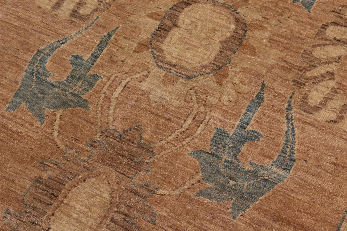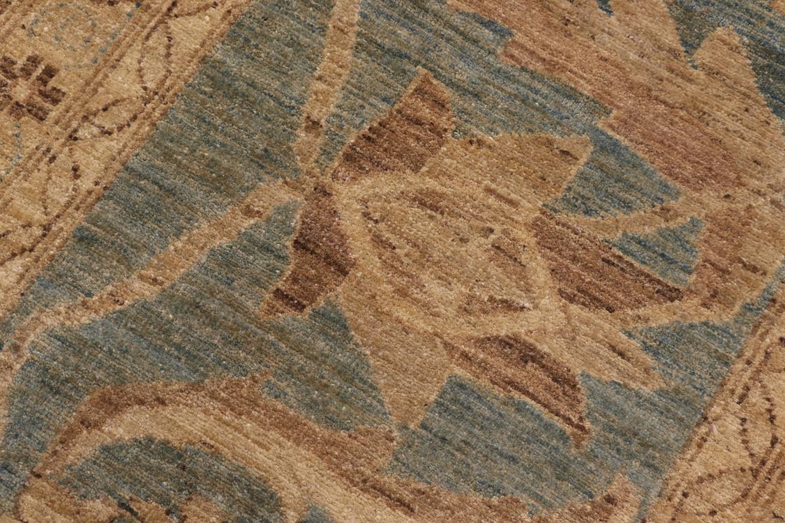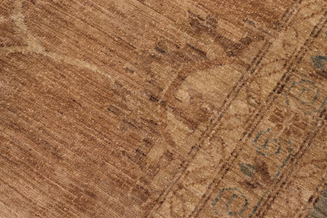 Enhance the ambiance of your home with this magnificent Persian-influenced Turkish hand-knotted rug made by skilled artisans capable of creating the most exceptional vegetable dyes and hand-spun wool. This exquisite handmade rug is a one-of-a-kind Peshawar Kafkaz, otherwise identified as Chobi, Chobi Peshawar, Oushak, or Ziegler rug. These handmade rugs are crafted in Pakistan utilizing superior-quality wool imported from Australia, New Zealand, and Korea in two types of weaves: the Persian weave and the Mori weave. This rug is meticulously crafted by hand using the finest natural vegetable dyes extracted from local plants. The artisans use a blend of hand-spun local and fine merino wool, resulting in a rug with a compelling texture, higher lanolin content, and longer staple. The artisans occasionally incorporate natural or artificial silk into the pile to enhance specific motifs. The finished product is an awe-inspiring flawless design execution and an understated palette that exudes elegance. Contemporary Peshawar rugs draw inspiration from antique Persian designs and feature modern design motifs with vibrant color tones. Hand-knotted with all-natural dyes, resulting in a unique abrash effect and subtle color variations in the pile. Peshawar rugs are known for their stunning and vibrant colors, which were achieved through a process inspired by antique methods. The rug's pile is meticulously trimmed to a moderate thickness and then stone-washed and sun-dried, resulting in a natural sheen and pleasing color tones. Transform the ambiance of your room into a luxurious haven with this gorgeous rug featuring a beautiful color palette. This stunning rug features an intricate oriental design that showcases royalty and seamlessly complements any decor. Its hand-knotted construction and natural fibers provide a soft and comfortable feel underfoot, making it the perfect addition to any room.