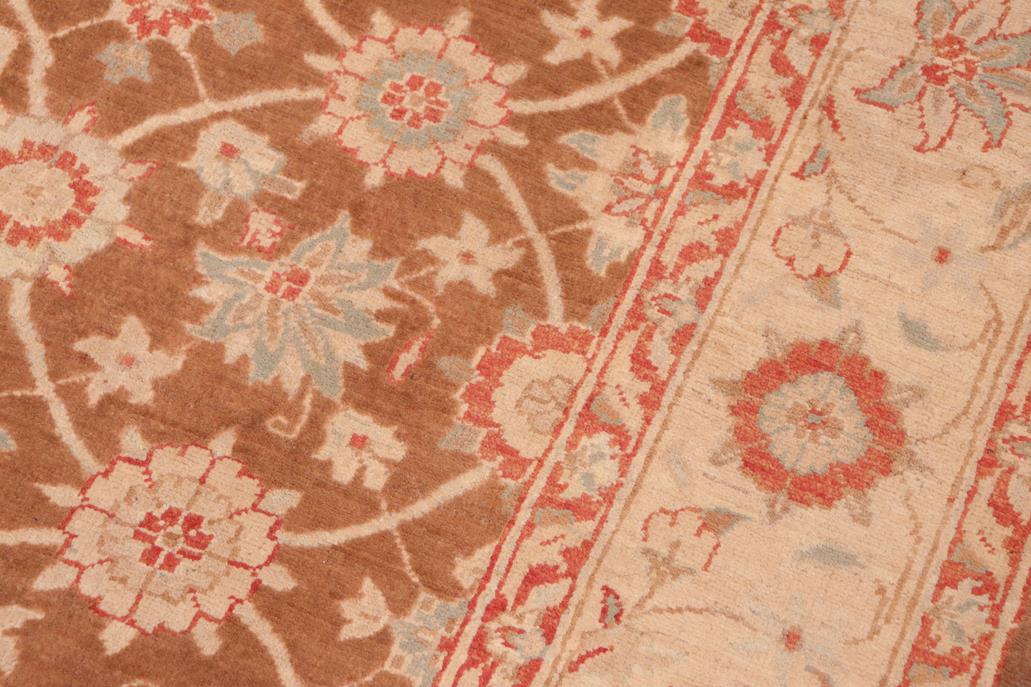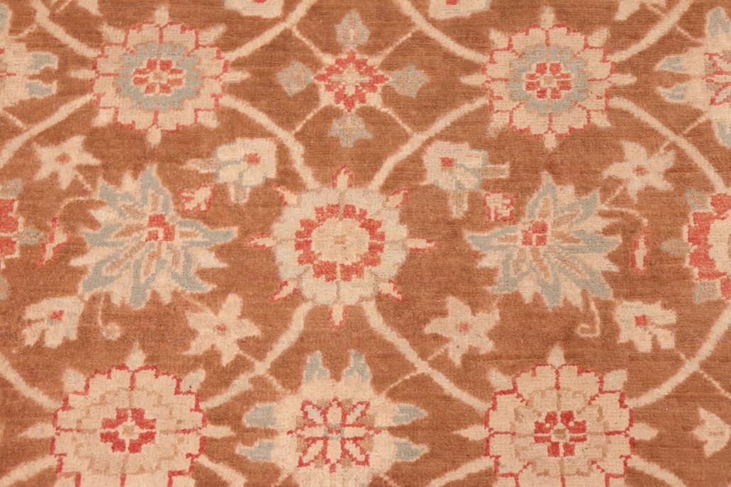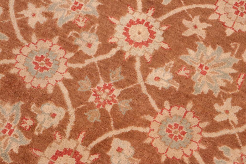 Enhance the ambiance of your home with this magnificent Persian-influenced Turkish hand-knotted rug made by skilled artisans capable of creating the most exceptional vegetable dyes and hand-spun wool. This exquisite handmade rug is a one-of-a-kind Peshawar Kafkaz, otherwise identified as Chobi, Chobi Peshawar, Oushak, or Ziegler rug. These handmade rugs are crafted in Pakistan utilizing superior-quality wool imported from Australia, New Zealand, and Korea in two types of weaves: the Persian weave and the Mori weave. This rug is meticulously crafted by hand using the finest natural vegetable dyes extracted from local plants. The artisans use a blend of hand-spun local and fine merino wool, resulting in a rug with a compelling texture, higher lanolin content, and longer staple. The artisans occasionally incorporate natural or artificial silk into the pile to enhance specific motifs. The finished product is an awe-inspiring flawless design execution and an understated palette that exudes elegance. Contemporary Peshawar rugs draw inspiration from antique Persian designs and feature modern design motifs with vibrant color tones. Hand-knotted with all-natural dyes, resulting in a unique abrash effect and subtle color variations in the pile. Peshawar rugs are known for their stunning and vibrant colors, which were achieved through a process inspired by antique methods. The rug's pile is meticulously trimmed to a moderate thickness and then stone-washed and sun-dried, resulting in a natural sheen and pleasing color tones. Transform the ambiance of your room into a luxurious haven with this gorgeous rug featuring a beautiful color palette. This stunning rug features an intricate oriental design that showcases royalty and seamlessly complements any decor. Its hand-knotted construction and natural fibers provide a soft and comfortable feel underfoot, making it the perfect addition to any room.