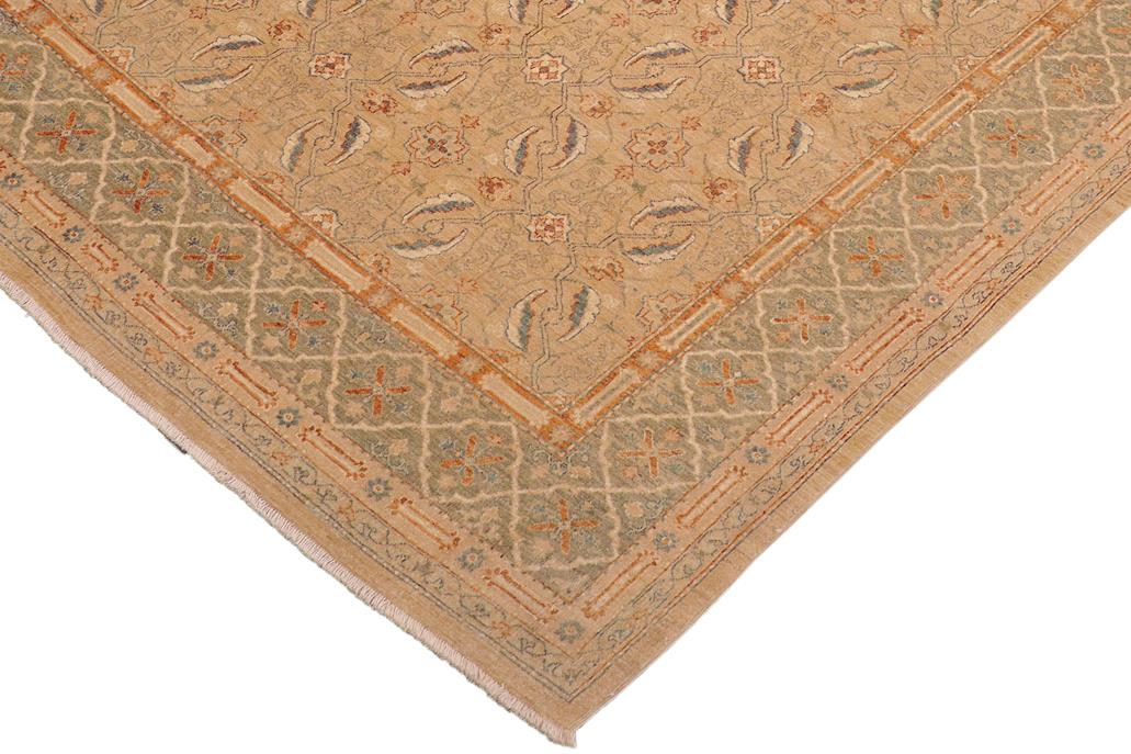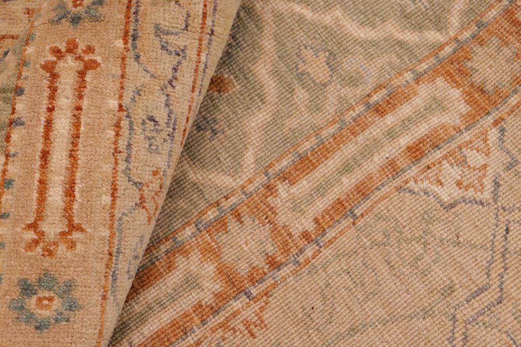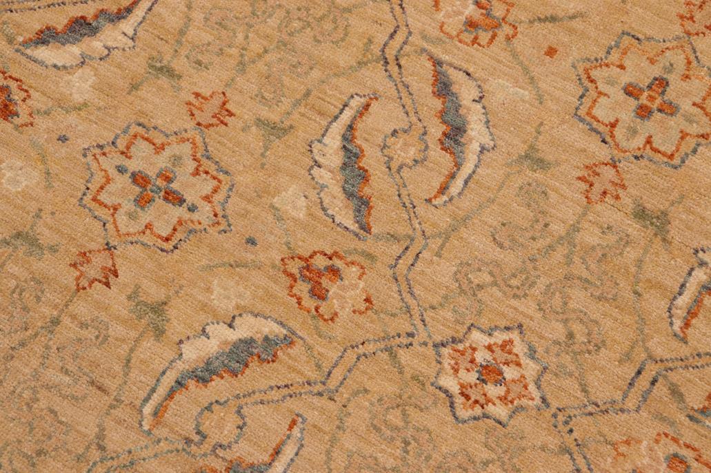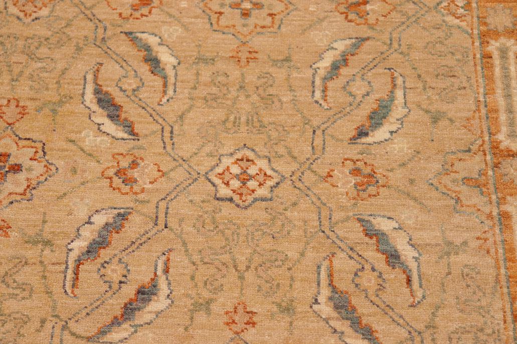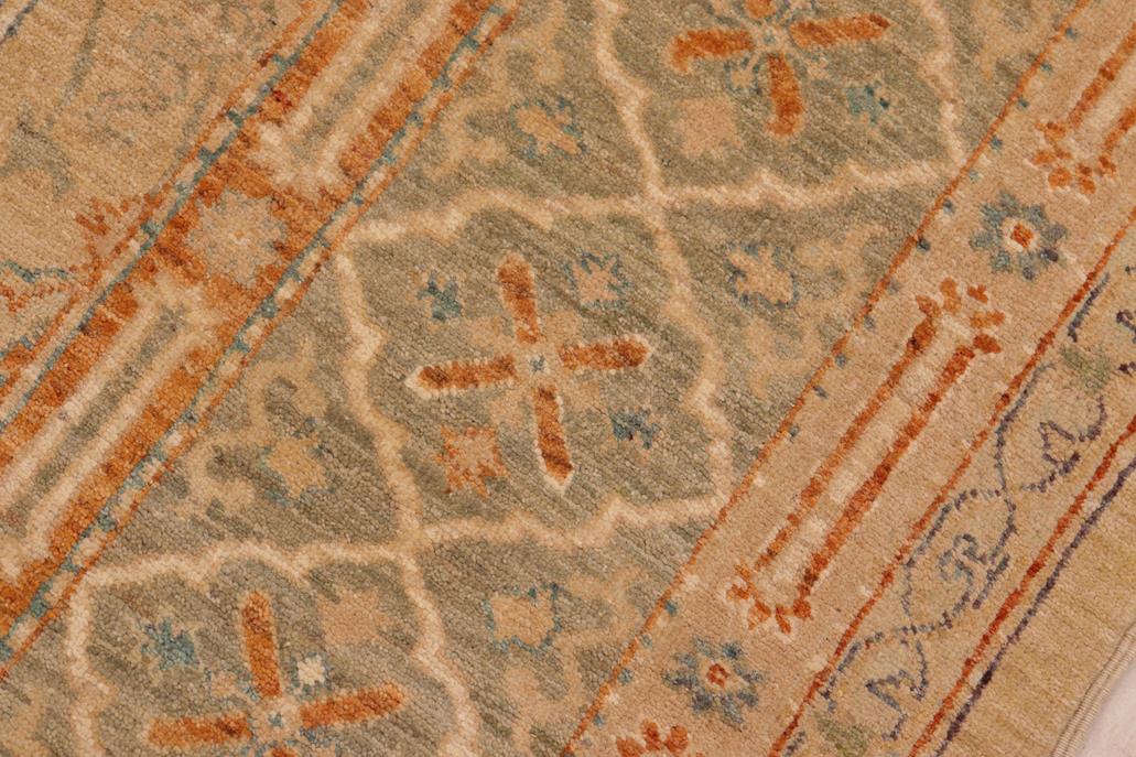 Enhance the ambiance of your home with this magnificent Persian-influenced Turkish hand-knotted rug made by skilled artisans capable of creating the most exceptional vegetable dyes and hand-spun wool. This exquisite handmade rug is a one-of-a-kind Peshawar Kafkaz, otherwise identified as Chobi, Chobi Peshawar, Oushak, or Ziegler rug. These handmade rugs are crafted in Pakistan utilizing superior-quality wool imported from Australia, New Zealand, and Korea in two types of weaves: the Persian weave and the Mori weave. This rug is meticulously crafted by hand using the finest natural vegetable dyes extracted from local plants. The artisans use a blend of hand-spun local and fine merino wool, resulting in a rug with a compelling texture, higher lanolin content, and longer staple. The artisans occasionally incorporate natural or artificial silk into the pile to enhance specific motifs. The finished product is an awe-inspiring flawless design execution and an understated palette that exudes elegance. Contemporary Peshawar rugs draw inspiration from antique Persian designs and feature modern design motifs with vibrant color tones. Hand-knotted with all-natural dyes, resulting in a unique abrash effect and subtle color variations in the pile. Peshawar rugs are known for their stunning and vibrant colors, which were achieved through a process inspired by antique methods. The rug's pile is meticulously trimmed to a moderate thickness and then stone-washed and sun-dried, resulting in a natural sheen and pleasing color tones. Transform the ambiance of your room into a luxurious haven with this gorgeous rug featuring a beautiful color palette. This stunning rug features an intricate oriental design that showcases royalty and seamlessly complements any decor. Its hand-knotted construction and natural fibers provide a soft and comfortable feel underfoot, making it the perfect addition to any room.