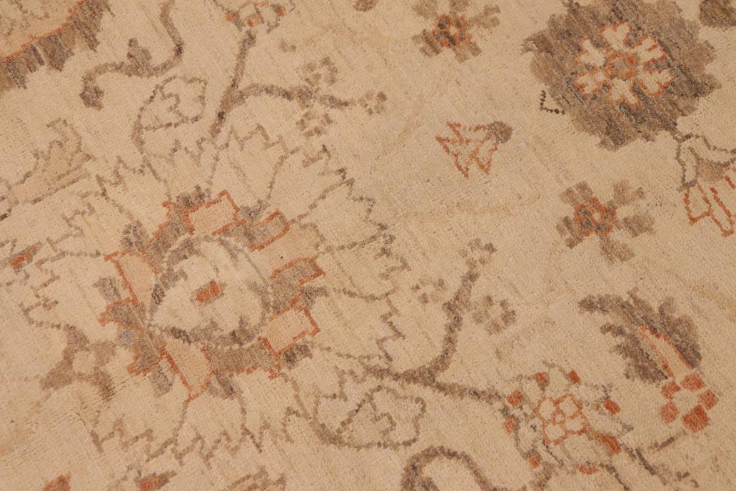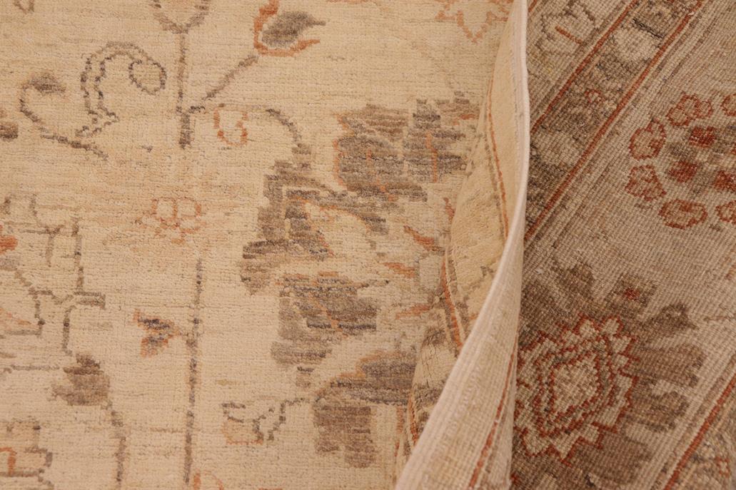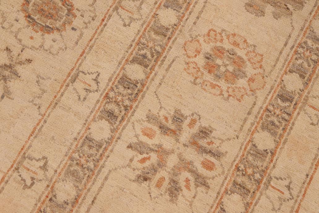 Enhance the ambiance of your home with this magnificent Persian-influenced Turkish hand-knotted rug made by skilled artisans capable of creating the most exceptional vegetable dyes and hand-spun wool. This exquisite handmade rug is a one-of-a-kind Peshawar Kafkaz, otherwise identified as Chobi, Chobi Peshawar, Oushak, or Ziegler rug. These handmade rugs are crafted in Pakistan utilizing superior-quality wool imported from Australia, New Zealand, and Korea in two types of weaves: the Persian weave and the Mori weave. This rug is meticulously crafted by hand using the finest natural vegetable dyes extracted from local plants. The artisans use a blend of hand-spun local and fine merino wool, resulting in a rug with a compelling texture, higher lanolin content, and longer staple. The artisans occasionally incorporate natural or artificial silk into the pile to enhance specific motifs. The finished product is an awe-inspiring flawless design execution and an understated palette that exudes elegance. Contemporary Peshawar rugs draw inspiration from antique Persian designs and feature modern design motifs with vibrant color tones. Hand-knotted with all-natural dyes, resulting in a unique abrash effect and subtle color variations in the pile. Peshawar rugs are known for their stunning and vibrant colors, which were achieved through a process inspired by antique methods. The rug's pile is meticulously trimmed to a moderate thickness and then stone-washed and sun-dried, resulting in a natural sheen and pleasing color tones. Transform the ambiance of your room into a luxurious haven with this gorgeous rug featuring a beautiful color palette. This stunning rug features an intricate oriental design that showcases royalty and seamlessly complements any decor. Its hand-knotted construction and natural fibers provide a soft and comfortable feel underfoot, making it the perfect addition to any room.