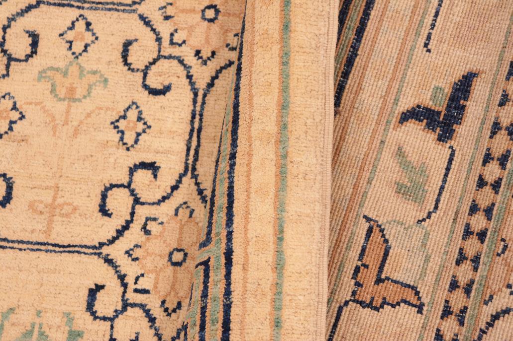 Enhance the ambiance of your home with this magnificent Persian-influenced Turkish hand-knotted rug made by skilled artisans capable of creating the most exceptional vegetable dyes and hand-spun wool. This exquisite handmade rug is a one-of-a-kind Peshawar Kafkaz, otherwise identified as Chobi, Chobi Peshawar, Oushak, or Ziegler rug. These handmade rugs are crafted in Pakistan utilizing superior-quality wool imported from Australia, New Zealand, and Korea in two types of weaves: the Persian weave and the Mori weave. This rug is meticulously crafted by hand using the finest natural vegetable dyes extracted from local plants. The artisans use a blend of hand-spun local and fine merino wool, resulting in a rug with a compelling texture, higher lanolin content, and longer staple. The artisans occasionally incorporate natural or artificial silk into the pile to enhance specific motifs. The finished product is an awe-inspiring flawless design execution and an understated palette that exudes elegance. Contemporary Peshawar rugs draw inspiration from antique Persian designs and feature modern design motifs with vibrant color tones. Hand-knotted with all-natural dyes, resulting in a unique abrash effect and subtle color variations in the pile. Peshawar rugs are known for their stunning and vibrant colors, which were achieved through a process inspired by antique methods. The rug's pile is meticulously trimmed to a moderate thickness and then stone-washed and sun-dried, resulting in a natural sheen and pleasing color tones. Transform the ambiance of your room into a luxurious haven with this gorgeous rug featuring a beautiful color palette. This stunning rug features an intricate oriental design that showcases royalty and seamlessly complements any decor. Its hand-knotted construction and natural fibers provide a soft and comfortable feel underfoot, making it the perfect addition to any room.