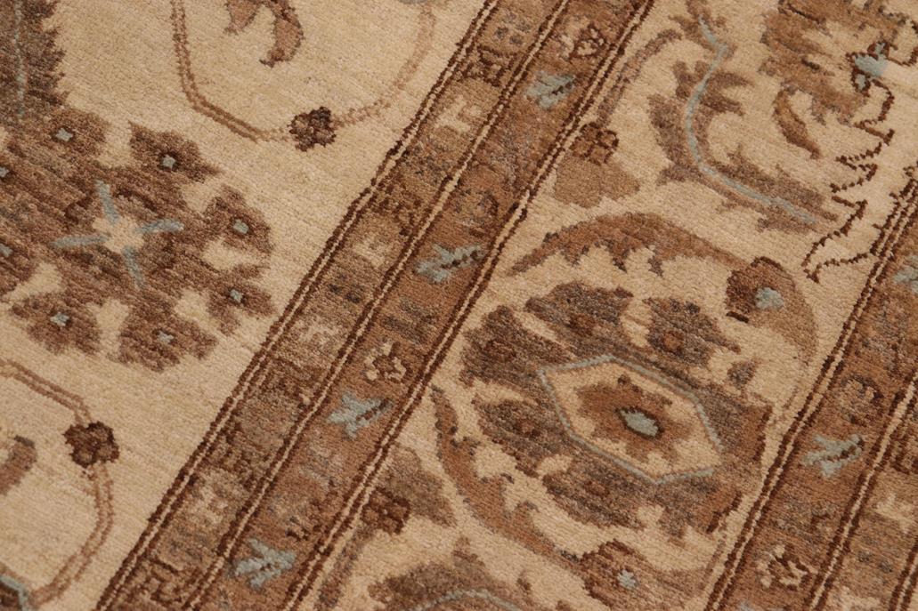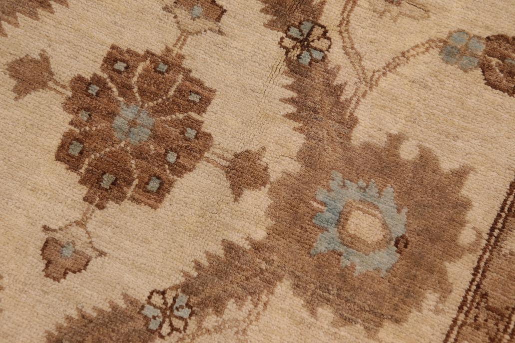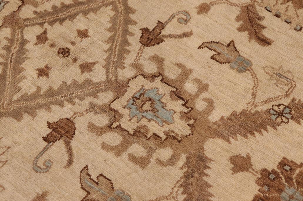 Enhance the ambiance of your home with this magnificent Persian-influenced Turkish hand-knotted rug made by skilled artisans capable of creating the most exceptional vegetable dyes and hand-spun wool. This exquisite handmade rug is a one-of-a-kind Peshawar Kafkaz, otherwise identified as Chobi, Chobi Peshawar, Oushak, or Ziegler rug. These handmade rugs are crafted in Pakistan utilizing superior-quality wool imported from Australia, New Zealand, and Korea in two types of weaves: the Persian weave and the Mori weave. This rug is meticulously crafted by hand using the finest natural vegetable dyes extracted from local plants. The artisans use a blend of hand-spun local and fine merino wool, resulting in a rug with a compelling texture, higher lanolin content, and longer staple. The artisans occasionally incorporate natural or artificial silk into the pile to enhance specific motifs. The finished product is an awe-inspiring flawless design execution and an understated palette that exudes elegance. Contemporary Peshawar rugs draw inspiration from antique Persian designs and feature modern design motifs with vibrant color tones. Hand-knotted with all-natural dyes, resulting in a unique abrash effect and subtle color variations in the pile. Peshawar rugs are known for their stunning and vibrant colors, which were achieved through a process inspired by antique methods. The rug's pile is meticulously trimmed to a moderate thickness and then stone-washed and sun-dried, resulting in a natural sheen and pleasing color tones. Transform the ambiance of your room into a luxurious haven with this gorgeous rug featuring a beautiful color palette. This stunning rug features an intricate oriental design that showcases royalty and seamlessly complements any decor. Its hand-knotted construction and natural fibers provide a soft and comfortable feel underfoot, making it the perfect addition to any room.