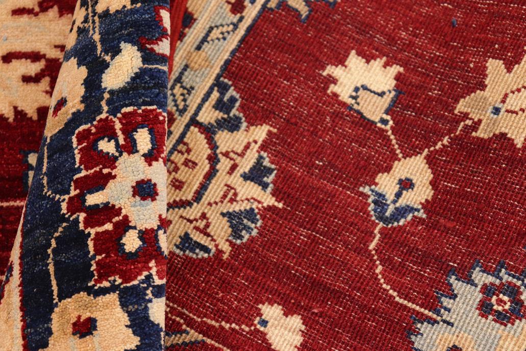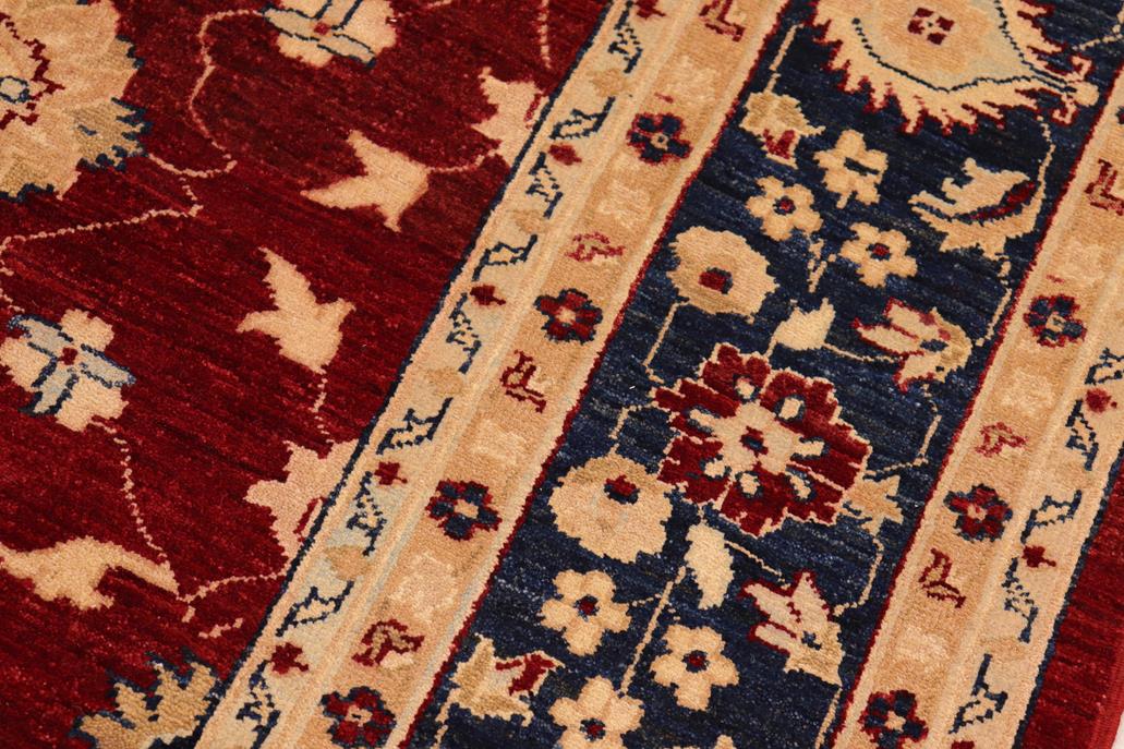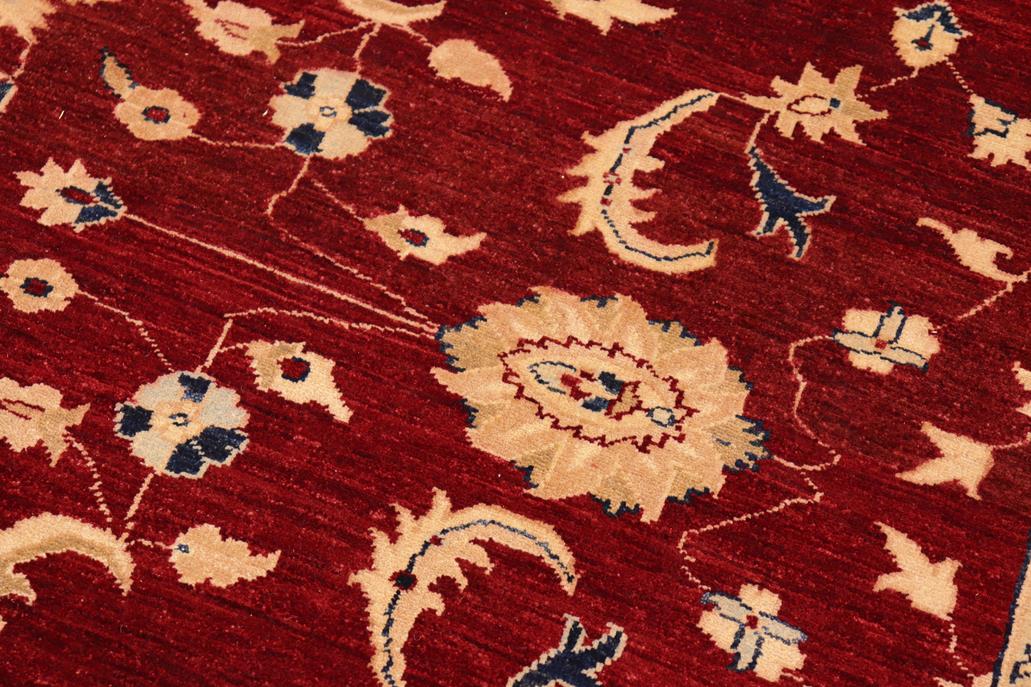 Enhance the ambiance of your home with this magnificent Persian-influenced Turkish hand-knotted rug made by skilled artisans capable of creating the most exceptional vegetable dyes and hand-spun wool. This exquisite handmade rug is a one-of-a-kind Peshawar Kafkaz, otherwise identified as Chobi, Chobi Peshawar, Oushak, or Ziegler rug. These handmade rugs are crafted in Pakistan utilizing superior-quality wool imported from Australia, New Zealand, and Korea in two types of weaves: the Persian weave and the Mori weave. This rug is meticulously crafted by hand using the finest natural vegetable dyes extracted from local plants. The artisans use a blend of hand-spun local and fine merino wool, resulting in a rug with a compelling texture, higher lanolin content, and longer staple. The artisans occasionally incorporate natural or artificial silk into the pile to enhance specific motifs. The finished product is an awe-inspiring flawless design execution and an understated palette that exudes elegance. Contemporary Peshawar rugs draw inspiration from antique Persian designs and feature modern design motifs with vibrant color tones. Hand-knotted with all-natural dyes, resulting in a unique abrash effect and subtle color variations in the pile. Peshawar rugs are known for their stunning and vibrant colors, which were achieved through a process inspired by antique methods. The rug's pile is meticulously trimmed to a moderate thickness and then stone-washed and sun-dried, resulting in a natural sheen and pleasing color tones. Transform the ambiance of your room into a luxurious haven with this gorgeous rug featuring a beautiful color palette. This stunning rug features an intricate oriental design that showcases royalty and seamlessly complements any decor. Its hand-knotted construction and natural fibers provide a soft and comfortable feel underfoot, making it the perfect addition to any room.