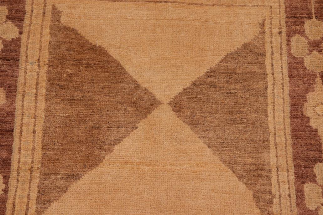 Enhance the ambiance of your home with this magnificent Persian-influenced Turkish hand-knotted rug made by skilled artisans capable of creating the most exceptional vegetable dyes and hand-spun wool. This exquisite handmade rug is a one-of-a-kind Peshawar Kafkaz, otherwise identified as Chobi, Chobi Peshawar, Oushak, or Ziegler rug. These handmade rugs are crafted in Pakistan utilizing superior-quality wool imported from Australia, New Zealand, and Korea in two types of weaves: the Persian weave and the Mori weave. This rug is meticulously crafted by hand using the finest natural vegetable dyes extracted from local plants. The artisans use a blend of hand-spun local and fine merino wool, resulting in a rug with a compelling texture, higher lanolin content, and longer staple. The artisans occasionally incorporate natural or artificial silk into the pile to enhance specific motifs. The finished product is an awe-inspiring flawless design execution and an understated palette that exudes elegance. Contemporary Peshawar rugs draw inspiration from antique Persian designs and feature modern design motifs with vibrant color tones. Hand-knotted with all-natural dyes, resulting in a unique abrash effect and subtle color variations in the pile. Peshawar rugs are known for their stunning and vibrant colors, which were achieved through a process inspired by antique methods. The rug's pile is meticulously trimmed to a moderate thickness and then stone-washed and sun-dried, resulting in a natural sheen and pleasing color tones. Transform the ambiance of your room into a luxurious haven with this gorgeous rug featuring a beautiful color palette. This stunning rug features an intricate oriental design that showcases royalty and seamlessly complements any decor. Its hand-knotted construction and natural fibers provide a soft and comfortable feel underfoot, making it the perfect addition to any room.