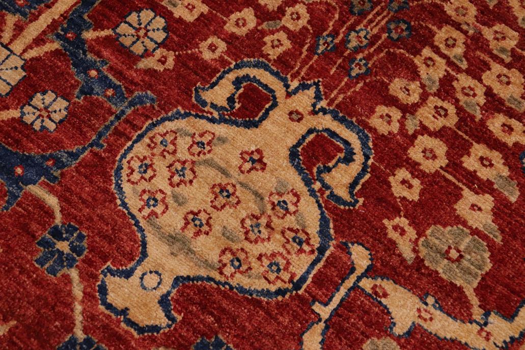 Enhance the ambiance of your home with this magnificent Persian-influenced Turkish hand-knotted rug made by skilled artisans capable of creating the most exceptional vegetable dyes and hand-spun wool. This exquisite handmade rug is a one-of-a-kind Peshawar Kafkaz, otherwise identified as Chobi, Chobi Peshawar, Oushak, or Ziegler rug. These handmade rugs are crafted in Pakistan utilizing superior-quality wool imported from Australia, New Zealand, and Korea in two types of weaves: the Persian weave and the Mori weave. This rug is meticulously crafted by hand using the finest natural vegetable dyes extracted from local plants. The artisans use a blend of hand-spun local and fine merino wool, resulting in a rug with a compelling texture, higher lanolin content, and longer staple. The artisans occasionally incorporate natural or artificial silk into the pile to enhance specific motifs. The finished product is an awe-inspiring flawless design execution and an understated palette that exudes elegance. Contemporary Peshawar rugs draw inspiration from antique Persian designs and feature modern design motifs with vibrant color tones. Hand-knotted with all-natural dyes, resulting in a unique abrash effect and subtle color variations in the pile. Peshawar rugs are known for their stunning and vibrant colors, which were achieved through a process inspired by antique methods. The rug's pile is meticulously trimmed to a moderate thickness and then stone-washed and sun-dried, resulting in a natural sheen and pleasing color tones. Transform the ambiance of your room into a luxurious haven with this gorgeous rug featuring a beautiful color palette. This stunning rug features an intricate oriental design that showcases royalty and seamlessly complements any decor. Its hand-knotted construction and natural fibers provide a soft and comfortable feel underfoot, making it the perfect addition to any room.