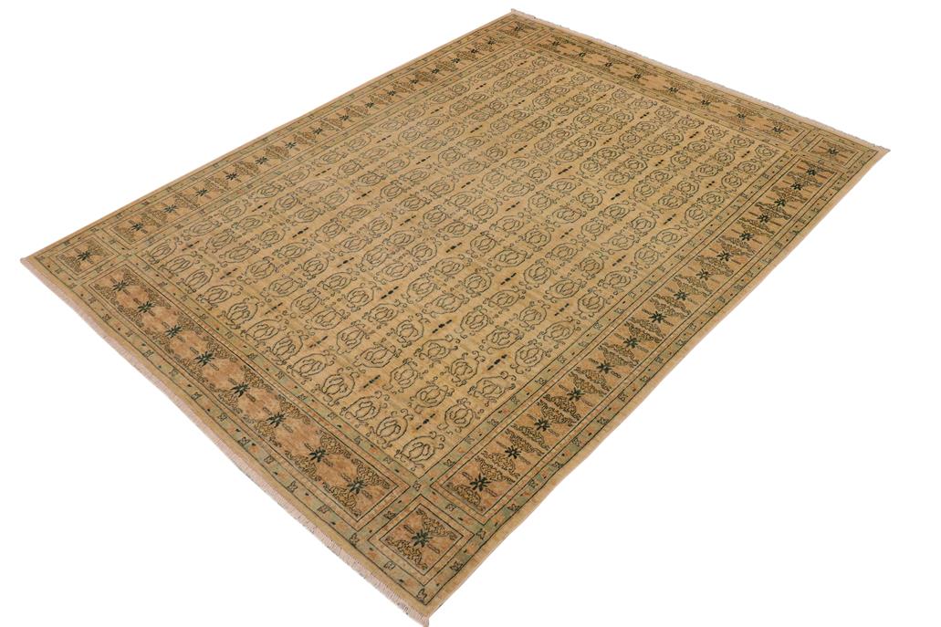Enhance the ambiance of your home with this magnificent Persian-influenced Turkish hand-knotted rug made by skilled artisans capable of creating the most exceptional vegetable dyes and hand-spun wool. This exquisite handmade rug is a one-of-a-kind Peshawar Kafkaz, otherwise identified as Chobi, Chobi Peshawar, Oushak, or Ziegler rug. These handmade rugs are crafted in Pakistan utilizing superior-quality wool imported from Australia, New Zealand, and Korea in two types of weaves: the Persian weave and the Mori weave. This rug is meticulously crafted by hand using the finest natural vegetable dyes extracted from local plants. The artisans use a blend of hand-spun local and fine merino wool, resulting in a rug with a compelling texture, higher lanolin content, and longer staple. The artisans occasionally incorporate natural or artificial silk into the pile to enhance specific motifs. The finished product is an awe-inspiring flawless design execution and an understated palette that exudes elegance. Contemporary Peshawar rugs draw inspiration from antique Persian designs and feature modern design motifs with vibrant color tones. Hand-knotted with all-natural dyes, resulting in a unique abrash effect and subtle color variations in the pile. Peshawar rugs are known for their stunning and vibrant colors, which were achieved through a process inspired by antique methods. The rug's pile is meticulously trimmed to a moderate thickness and then stone-washed and sun-dried, resulting in a natural sheen and pleasing color tones. Transform the ambiance of your room into a luxurious haven with this gorgeous rug featuring a beautiful color palette. This stunning rug features an intricate oriental design that showcases royalty and seamlessly complements any decor. Its hand-knotted construction and natural fibers provide a soft and comfortable feel underfoot, making it the perfect addition to any room.