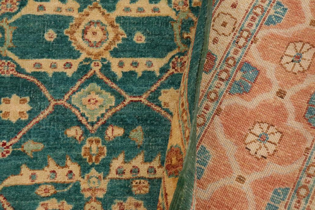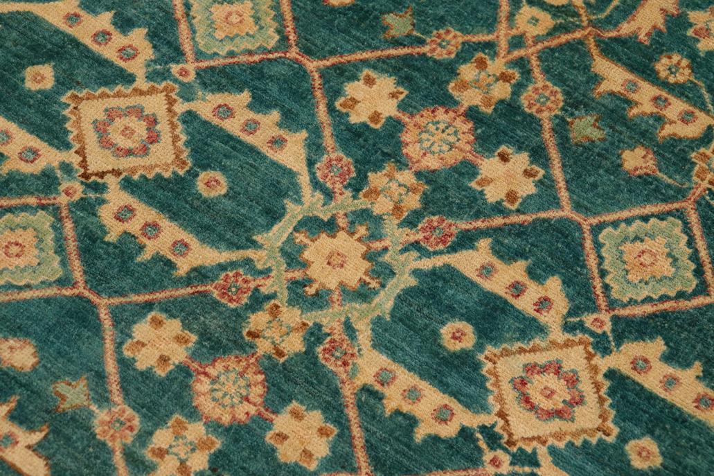Enhance the ambiance of your home with this magnificent Persian-influenced Turkish hand-knotted rug made by skilled artisans capable of creating the most exceptional vegetable dyes and hand-spun wool. This exquisite handmade rug is a one-of-a-kind Peshawar Kafkaz, otherwise identified as Chobi, Chobi Peshawar, Oushak, or Ziegler rug. These handmade rugs are crafted in Pakistan utilizing superior-quality wool imported from Australia, New Zealand, and Korea in two types of weaves: the Persian weave and the Mori weave. This rug is meticulously crafted by hand using the finest natural vegetable dyes extracted from local plants. The artisans use a blend of hand-spun local and fine merino wool, resulting in a rug with a compelling texture, higher lanolin content, and longer staple. The artisans occasionally incorporate natural or artificial silk into the pile to enhance specific motifs. The finished product is an awe-inspiring flawless design execution and an understated palette that exudes elegance. Contemporary Peshawar rugs draw inspiration from antique Persian designs and feature modern design motifs with vibrant color tones. Hand-knotted with all-natural dyes, resulting in a unique abrash effect and subtle color variations in the pile. Peshawar rugs are known for their stunning and vibrant colors, which were achieved through a process inspired by antique methods. The rug's pile is meticulously trimmed to a moderate thickness and then stone-washed and sun-dried, resulting in a natural sheen and pleasing color tones. Transform the ambiance of your room into a luxurious haven with this gorgeous rug featuring a beautiful color palette. This stunning rug features an intricate oriental design that showcases royalty and seamlessly complements any decor. Its hand-knotted construction and natural fibers provide a soft and comfortable feel underfoot, making it the perfect addition to any room.