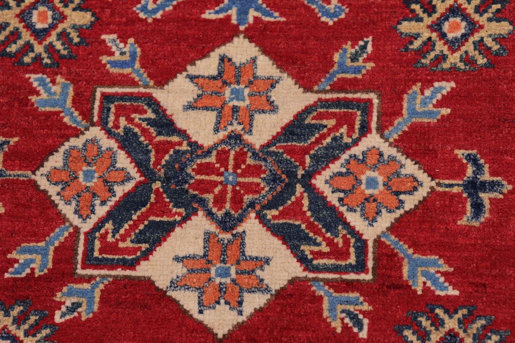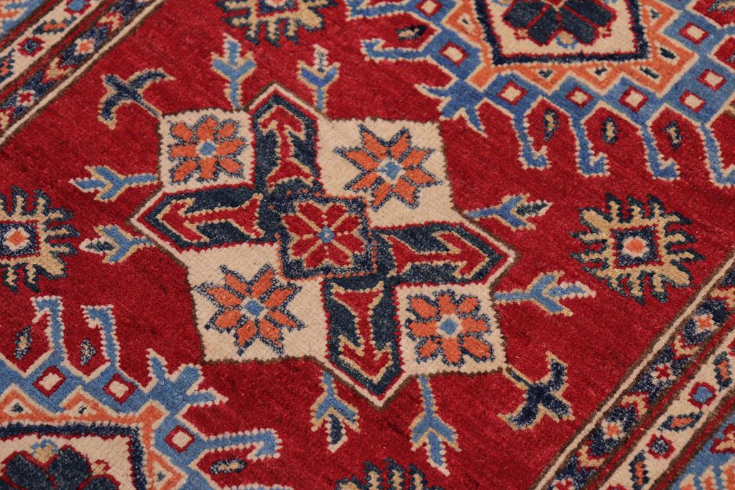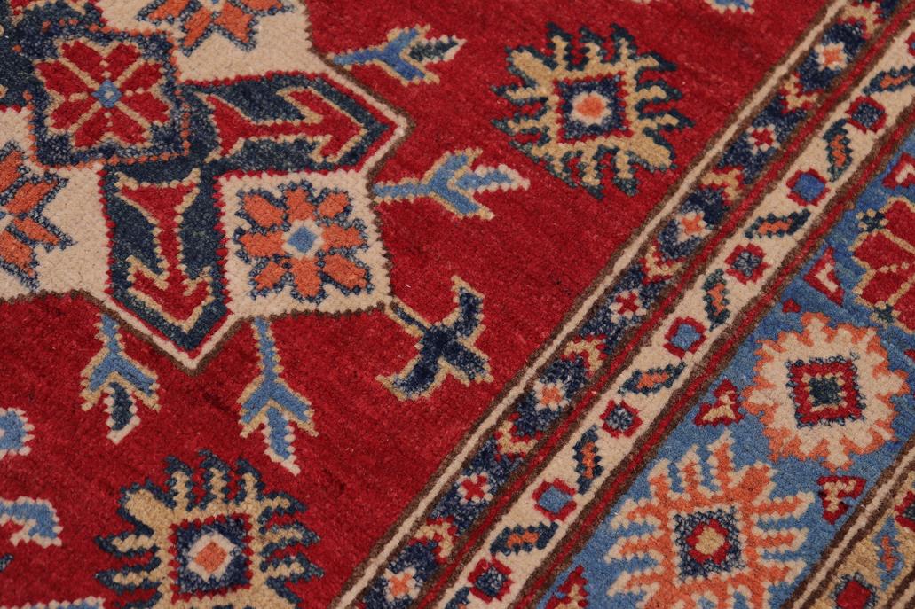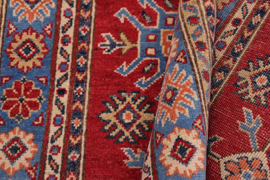 Enhance your home with this exquisite hand-knotted Kazak rug, crafted from fine hand-spun wool and dyed with all-natural vegetable dyes. This masterpiece features intricate Kazak patterns in a classic color palette, showcasing bold tones and geometric designs. Originating from the Caucasian regions of Russia and northern Persia, each Kazak rug reflects a unique tribal style, incorporating stepped polygons, medallions, images of animals, and rosettes. The soft, luxurious pile and vibrant color palette of blues, reds, greens, and gold make it an ideal choice for high-traffic areas, combining durability and beauty. With their geometric and curvilinear designs, Kazak rugs have a rich history dating back centuries to the Kazakhstan region. These handmade rugs use Turkish knots and natural dyes, resulting in a short pile with an antique finish. Their stunning patterns and colors make them versatile to complement both traditional and modern decor.