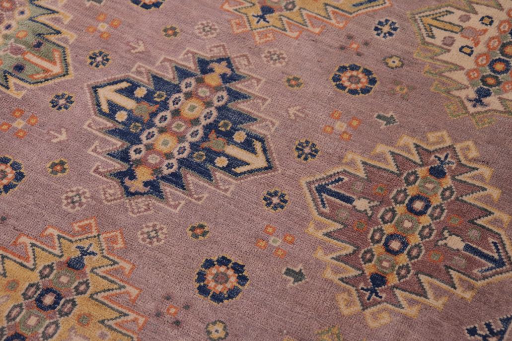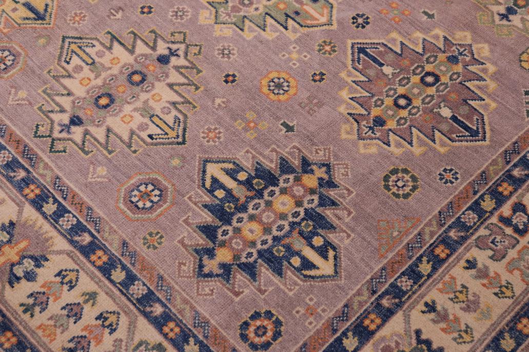 Enhance your home with this exquisite hand-knotted Kazak rug, crafted from fine hand-spun wool and dyed with all-natural vegetable dyes. This masterpiece features intricate Kazak patterns in a classic color palette, showcasing bold tones and geometric designs. Originating from the Caucasian regions of Russia and northern Persia, each Kazak rug reflects a unique tribal style, incorporating stepped polygons, medallions, images of animals, and rosettes. The soft, luxurious pile and vibrant color palette of blues, reds, greens, and gold make it an ideal choice for high-traffic areas, combining durability and beauty. With their geometric and curvilinear designs, Kazak rugs have a rich history dating back centuries to the Kazakhstan region. These handmade rugs use Turkish knots and natural dyes, resulting in a short pile with an antique finish. Their stunning patterns and colors make them versatile to complement both traditional and modern decor.