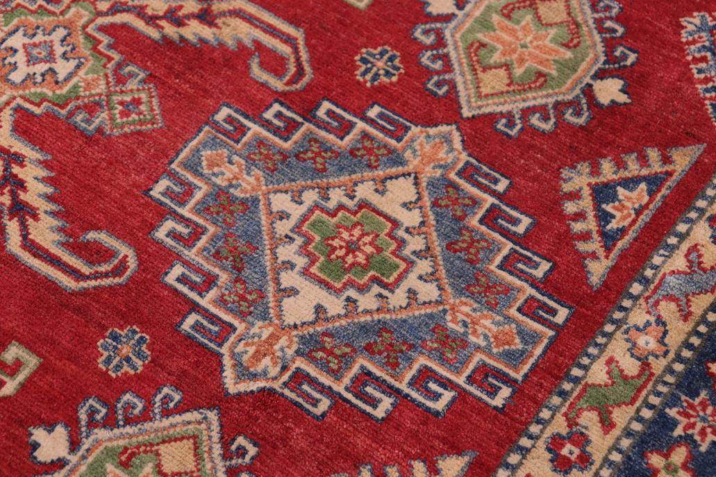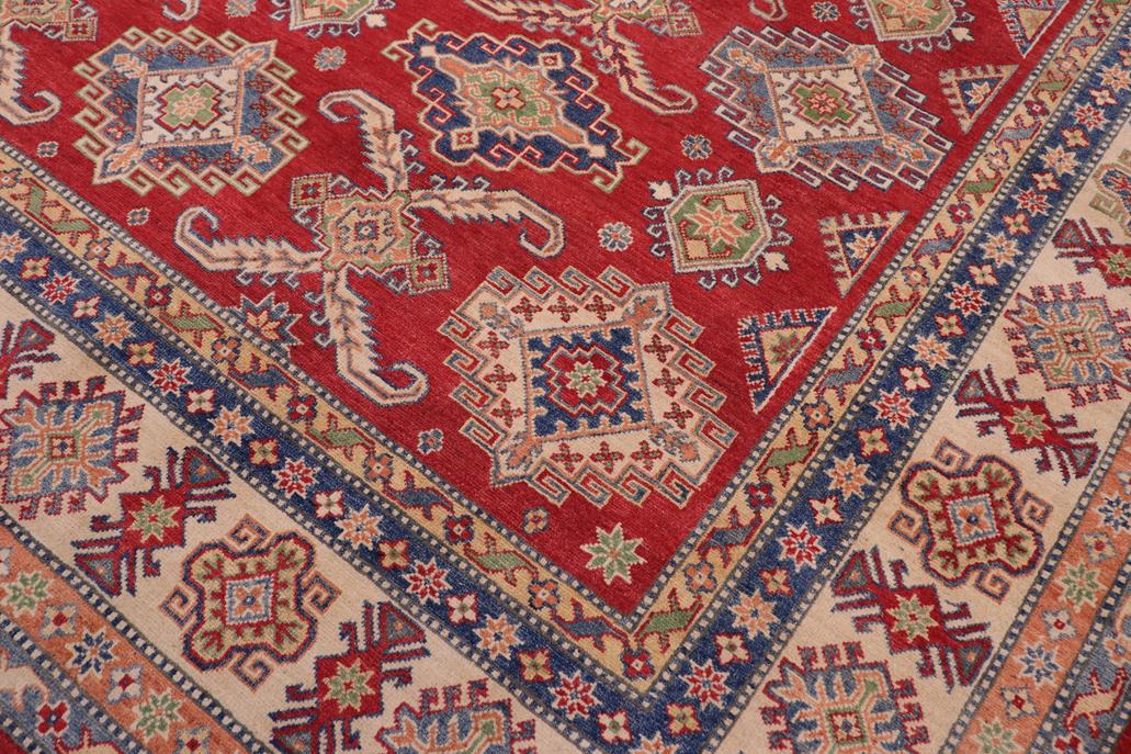 Enhance your home with this exquisite hand-knotted Kazak rug, crafted from fine hand-spun wool and dyed with all-natural vegetable dyes. This masterpiece features intricate Kazak patterns in a classic color palette, showcasing bold tones and geometric designs. Originating from the Caucasian regions of Russia and northern Persia, each Kazak rug reflects a unique tribal style, incorporating stepped polygons, medallions, images of animals, and rosettes. The soft, luxurious pile and vibrant color palette of blues, reds, greens, and gold make it an ideal choice for high-traffic areas, combining durability and beauty. With their geometric and curvilinear designs, Kazak rugs have a rich history dating back centuries to the Kazakhstan region. These handmade rugs use Turkish knots and natural dyes, resulting in a short pile with an antique finish. Their stunning patterns and colors make them versatile to complement both traditional and modern decor.