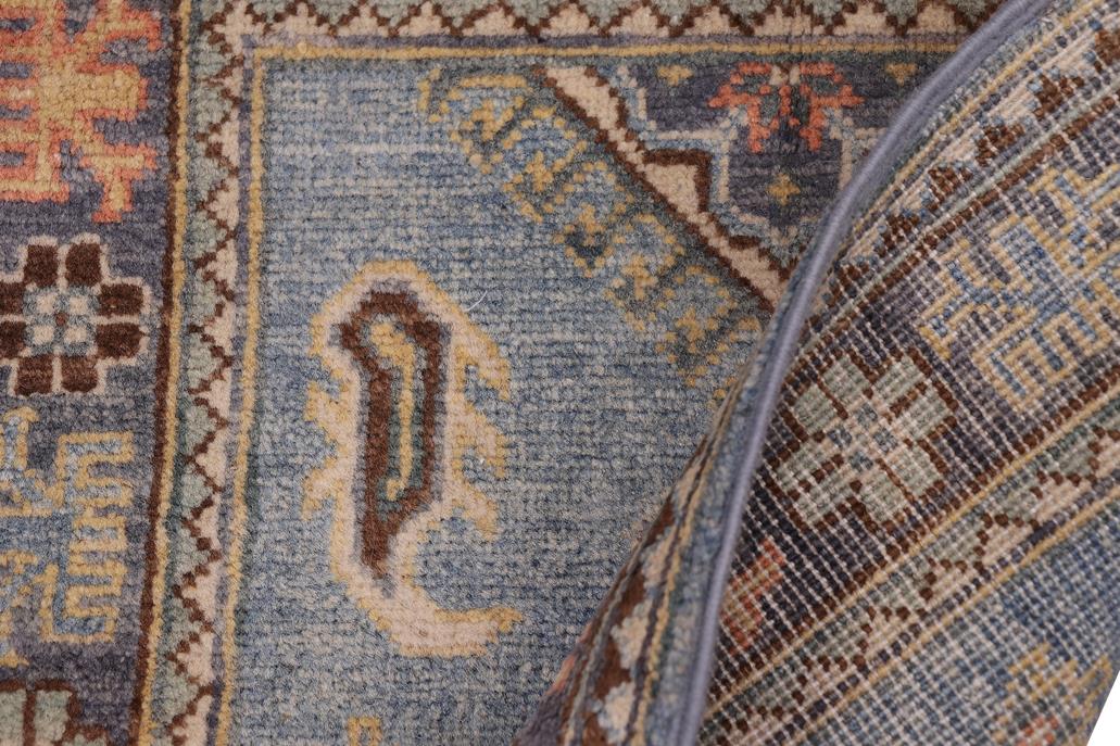 Enhance your home with this exquisite hand-knotted Kazak rug, crafted from fine hand-spun wool and dyed with all-natural vegetable dyes. This masterpiece features intricate Kazak patterns in a classic color palette, showcasing bold tones and geometric designs. Originating from the Caucasian regions of Russia and northern Persia, each Kazak rug reflects a unique tribal style, incorporating stepped polygons, medallions, images of animals, and rosettes. The soft, luxurious pile and vibrant color palette of blues, reds, greens, and gold make it an ideal choice for high-traffic areas, combining durability and beauty. With their geometric and curvilinear designs, Kazak rugs have a rich history dating back centuries to the Kazakhstan region. These handmade rugs use Turkish knots and natural dyes, resulting in a short pile with an antique finish. Their stunning patterns and colors make them versatile to complement both traditional and modern decor.