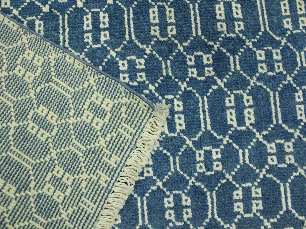 This elegant hand knotted rug features a modern fusion of beauty, with its interlocking geometric and minimalist pattern. This exclusive rug defies the ordinary by fusing art and design with detail and craftsmanship. A repeating intricate pattern of stylized interlocking diamond motif, with two toned colored pallets made with wool and viscous silk, this beautiful handmade rug adds a perfect finishing of elegance and luxurious feel to your decor.