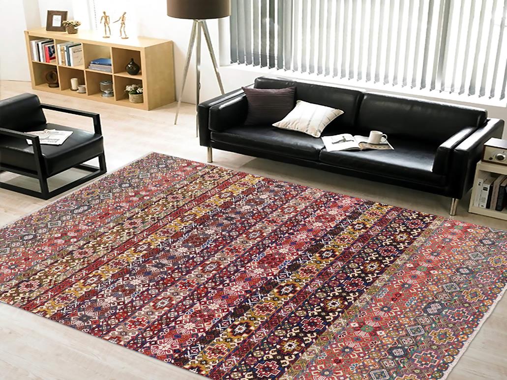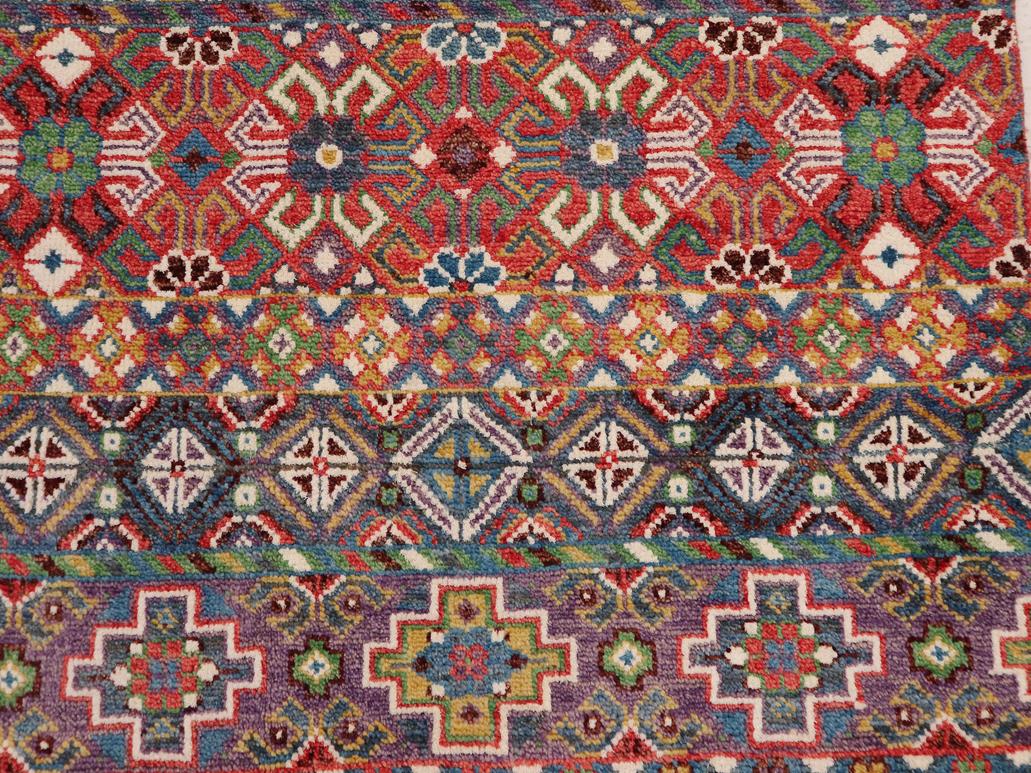 Designed with a mesmerizing intricate transitional and geometric motif this glorious hand knotted rug made with handspun Ghazni wool is a masterpiece that will fill any space with sophistication and grace. Hand knotted by skilled artisans in an exhilarating color pallet with an elaborate design, this masterpiece features luxurious hand spun wool with all vegetable dyes to add comfort and style to your decor. The design, color, and beautiful chromatic composition with a sheen in transitional and geometric designs, exude beauty, elegance and quality make this rug an extraordinarily opulent center piece for your living space. The intricate designs known as Khurgeen, Khorgeen or Khorjin range are inspired by the patterns from ancient tribal bags. An infusion of bold, saturated color gives this traditional hand-knotted rug a fresh perspective and modern appeal. Most desired due to its versatility in design and affordability this handmade rug is in a compelling focal point in any living area.