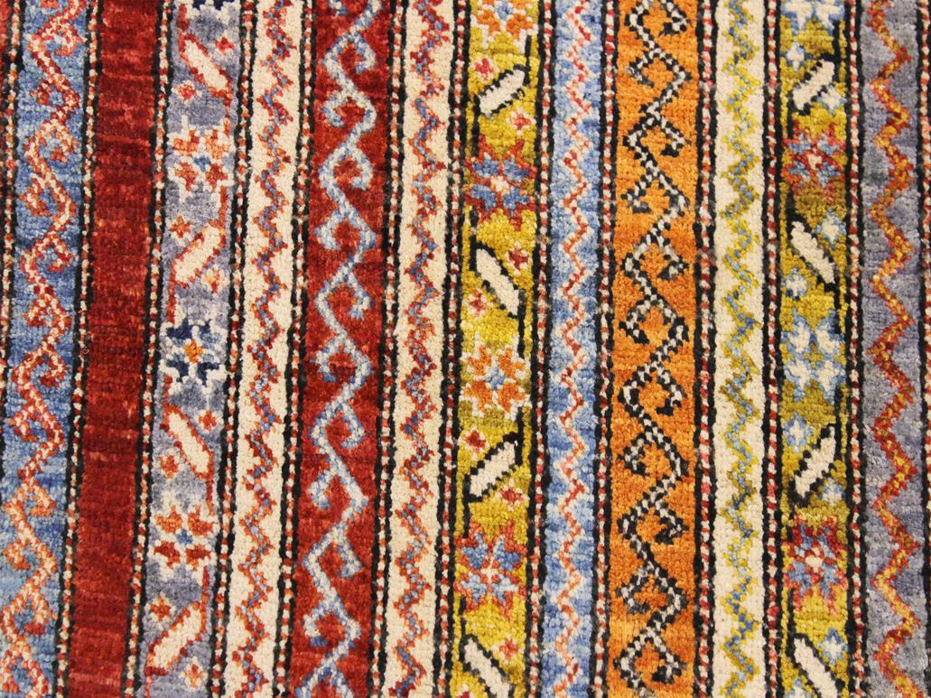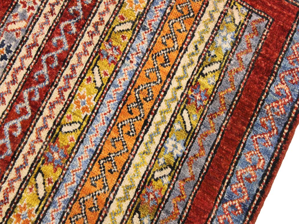 Designed with a mesmerizing intricate transitional and geometric motif this glorious hand knotted rug is a masterpiece that will fill any space with sophistication and grace. An exhilarating color pallet with an elaborate design, this masterpiece features luxurious hand spun wool with all vegetable dyes to add comfort and style to your decor. The design, color and beautiful chromatic composition with a sheen in transitional and geometric designs, exude beauty, elegance and quality make this rug an extraordinarily opulent center piece for your living space.