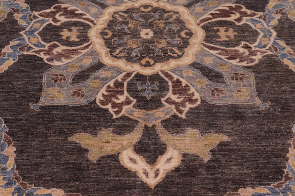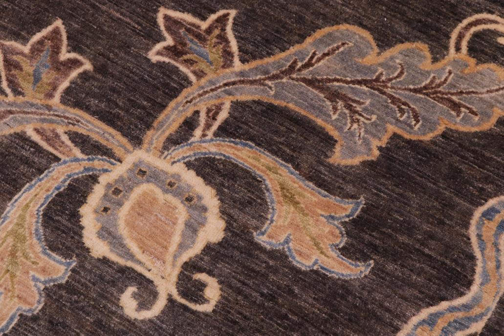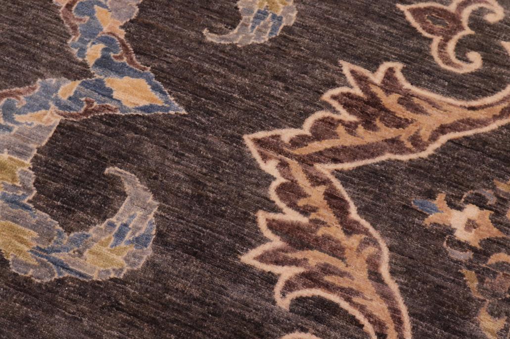 Enhance the ambiance of your home with this magnificent Persian-influenced Turkish hand-knotted rug made by skilled artisans capable of creating the most exceptional vegetable dyes and hand-spun wool. This exquisite handmade rug is a one-of-a-kind Peshawar Kafkaz, otherwise identified as Chobi, Chobi Peshawar, Oushak, or Ziegler rug. These handmade rugs are crafted in Pakistan utilizing superior-quality wool imported from Australia, New Zealand, and Korea in two types of weaves: the Persian weave and the Mori weave. This rug is meticulously crafted by hand using the finest natural vegetable dyes extracted from local plants. The artisans use a blend of hand-spun local and fine merino wool, resulting in a rug with a compelling texture, higher lanolin content, and longer staple. The artisans occasionally incorporate natural or artificial silk into the pile to enhance specific motifs. The finished product is an awe-inspiring flawless design execution and an understated palette that exudes elegance. Contemporary Peshawar rugs draw inspiration from antique Persian designs and feature modern design motifs with vibrant color tones. Hand-knotted with all-natural dyes, resulting in a unique abrash effect and subtle color variations in the pile. Peshawar rugs are known for their stunning and vibrant colors, which were achieved through a process inspired by antique methods. The rug's pile is meticulously trimmed to a moderate thickness and then stone-washed and sun-dried, resulting in a natural sheen and pleasing color tones. Transform the ambiance of your room into a luxurious haven with this gorgeous rug featuring a beautiful color palette. This stunning rug features an intricate oriental design that showcases royalty and seamlessly complements any decor. Its hand-knotted construction and natural fibers provide a soft and comfortable feel underfoot, making it the perfect addition to any room.