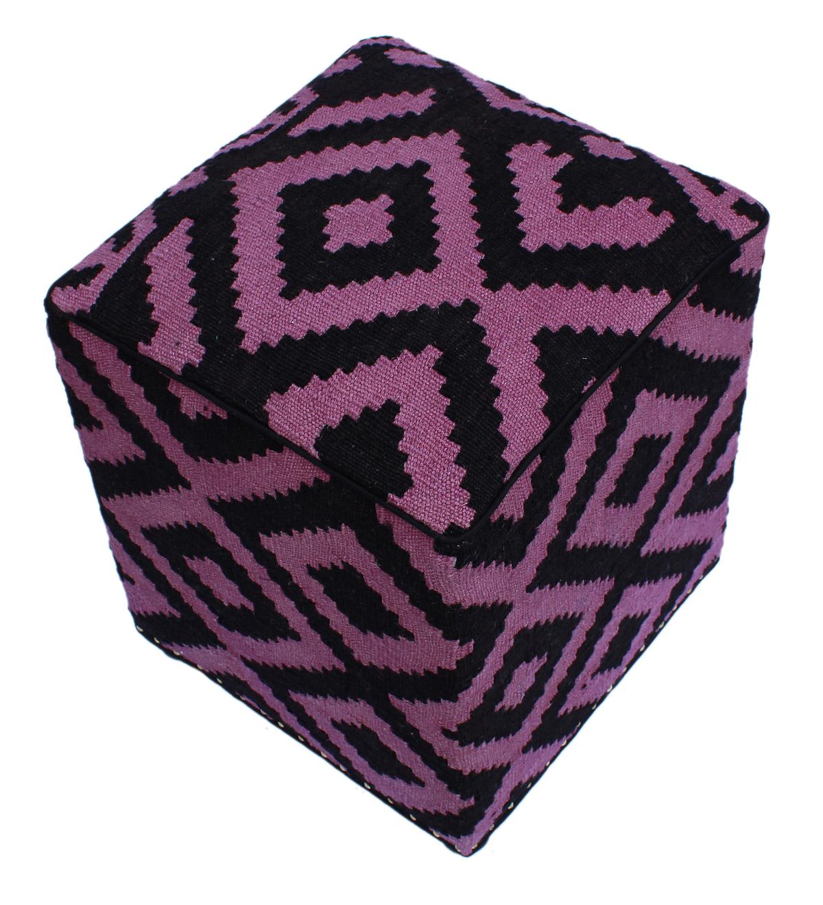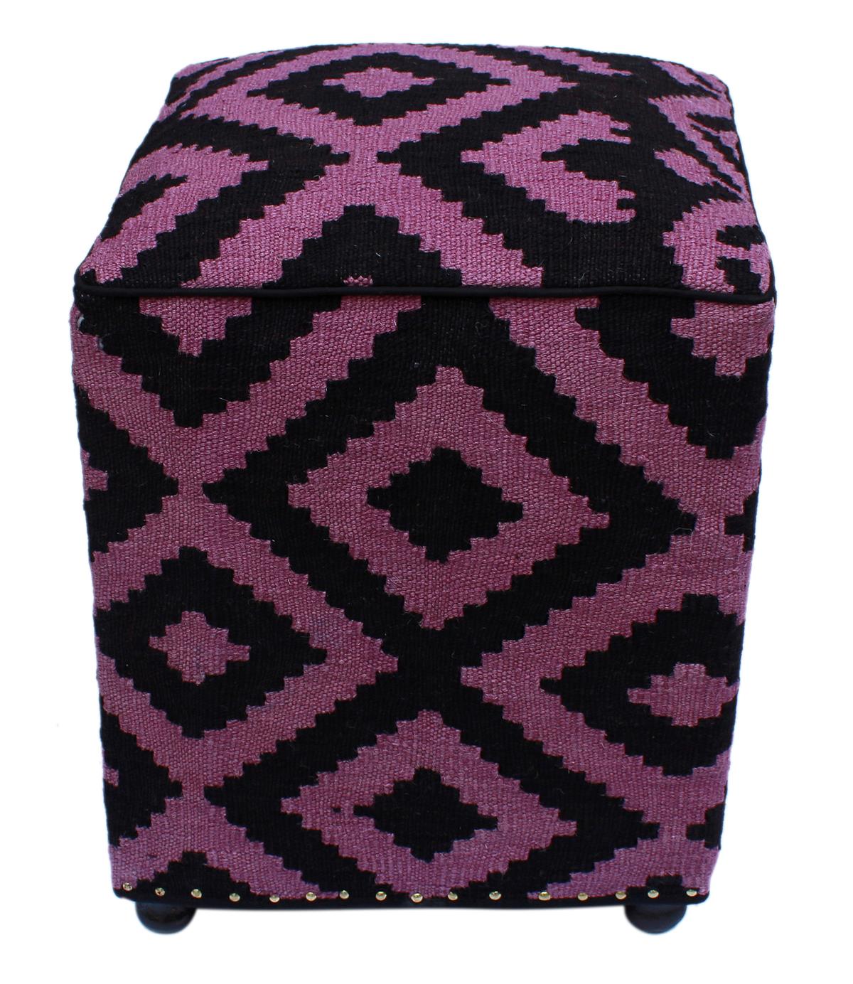 Chic handmade ottoman crafted using wood and upholstered using hand-woven kilim wool rug is a multi-purpose fashion pouf which will add dimension, color and style to your decor. Inspired by geometric motifs in any array of effervescent color pallet grounds any space with elegance and sophistication.