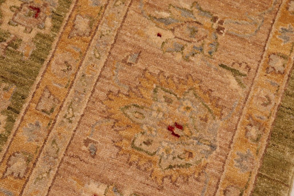 Enhance the ambiance of your home with this magnificent Persian-influenced Turkish hand-knotted rug made by skilled artisans capable of creating the most exceptional vegetable dyes and hand-spun wool. This exquisite handmade rug is a one-of-a-kind Peshawar Kafkaz, otherwise identified as Chobi, Chobi Peshawar, Oushak, or Ziegler rug. These handmade rugs are crafted in Pakistan utilizing superior-quality wool imported from Australia, New Zealand, and Korea in two types of weaves: the Persian weave and the Mori weave. This rug is meticulously crafted by hand using the finest natural vegetable dyes extracted from local plants. The artisans use a blend of hand-spun local and fine merino wool, resulting in a rug with a compelling texture, higher lanolin content, and longer staple. The artisans occasionally incorporate natural or artificial silk into the pile to enhance specific motifs. The finished product is an awe-inspiring flawless design execution and an understated palette that exudes elegance. Contemporary Peshawar rugs draw inspiration from antique Persian designs and feature modern design motifs with vibrant color tones. Hand-knotted with all-natural dyes, resulting in a unique abrash effect and subtle color variations in the pile. Peshawar rugs are known for their stunning and vibrant colors, which were achieved through a process inspired by antique methods. The rug's pile is meticulously trimmed to a moderate thickness and then stone-washed and sun-dried, resulting in a natural sheen and pleasing color tones. Transform the ambiance of your room into a luxurious haven with this gorgeous rug featuring a beautiful color palette. This stunning rug features an intricate oriental design that showcases royalty and seamlessly complements any decor. Its hand-knotted construction and natural fibers provide a soft and comfortable feel underfoot, making it the perfect addition to any room.