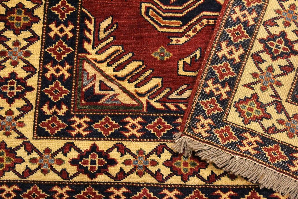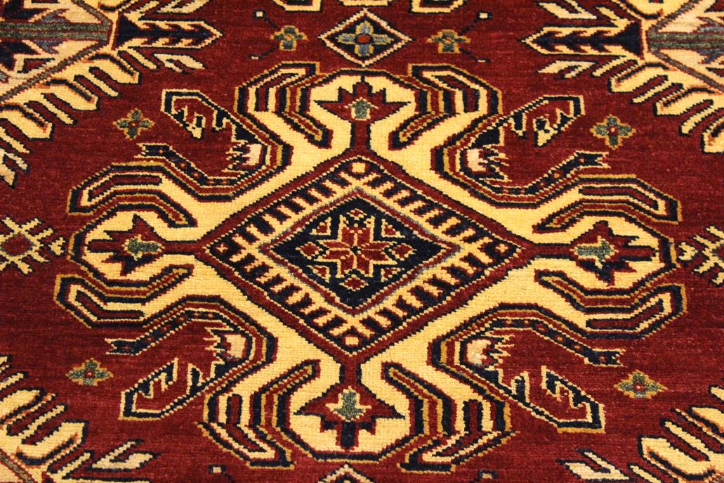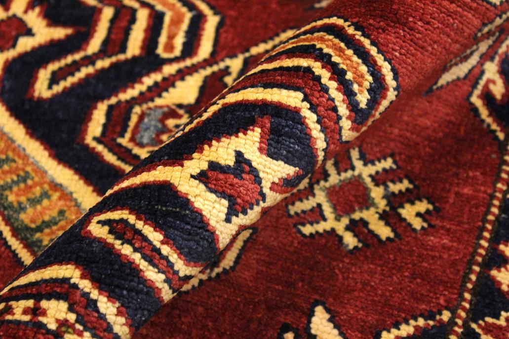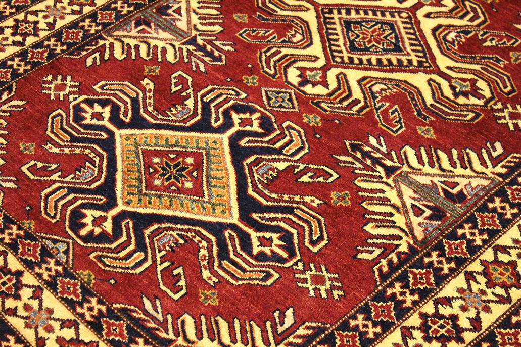 Enhance your home with this exquisite hand-knotted Super Kazak rug, crafted from fine hand-spun wool and dyed with all-natural vegetable dyes. This masterpiece features intricate Super Kazak patterns in a classic color palette, showcasing bold tones and geometric designs. Originating from the Caucasian regions of Russia and northern Persia, each Super Kazak rug reflects a unique tribal style, incorporating stepped polygons, medallions, images of animals, and rosettes. The soft, luxurious pile and vibrant color palette of blues, reds, greens, and gold make it an ideal choice for high-traffic areas, combining durability and beauty. With their geometric and curvilinear designs, Super Kazak rugs have a rich history dating back centuries to the Super Kazakhstan region. These handmade rugs use Turkish knots and natural dyes, resulting in a short pile with an antique finish. Their stunning patterns and colors make them versatile to complement both traditional and modern decor.