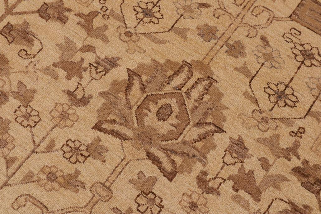 Enhance the ambiance of your home with this magnificent Persian-influenced Turkish hand-knotted rug made by skilled artisans capable of creating the most exceptional vegetable dyes and hand-spun wool. This exquisite handmade rug is a one-of-a-kind Peshawar Kafkaz, otherwise identified as Chobi, Chobi Peshawar, Oushak, or Ziegler rug. These handmade rugs are crafted in Pakistan utilizing superior-quality wool imported from Australia, New Zealand, and Korea in two types of weaves: the Persian weave and the Mori weave. This rug is meticulously crafted by hand using the finest natural vegetable dyes extracted from local plants. The artisans use a blend of hand-spun local and fine merino wool, resulting in a rug with a compelling texture, higher lanolin content, and longer staple. The artisans occasionally incorporate natural or artificial silk into the pile to enhance specific motifs. The finished product is an awe-inspiring flawless design execution and an understated palette that exudes elegance. Contemporary Peshawar rugs draw inspiration from antique Persian designs and feature modern design motifs with vibrant color tones. Hand-knotted with all-natural dyes, resulting in a unique abrash effect and subtle color variations in the pile. Peshawar rugs are known for their stunning and vibrant colors, which were achieved through a process inspired by antique methods. The rug's pile is meticulously trimmed to a moderate thickness and then stone-washed and sun-dried, resulting in a natural sheen and pleasing color tones. Transform the ambiance of your room into a luxurious haven with this gorgeous rug featuring a beautiful color palette. This stunning rug features an intricate oriental design that showcases royalty and seamlessly complements any decor. Its hand-knotted construction and natural fibers provide a soft and comfortable feel underfoot, making it the perfect addition to any room.