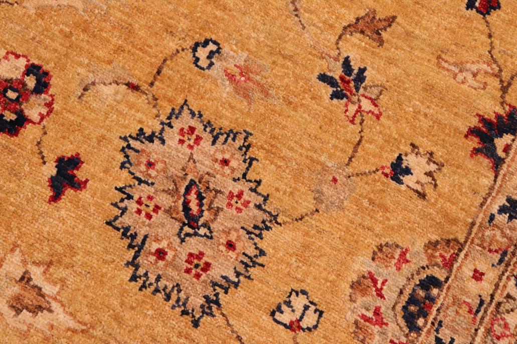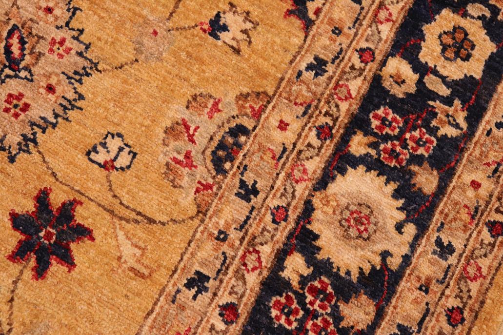 Enhance the ambiance of your home with this magnificent Persian-influenced Turkish hand-knotted rug made by skilled artisans capable of creating the most exceptional vegetable dyes and hand-spun wool. This exquisite handmade rug is a one-of-a-kind Peshawar Kafkaz, otherwise identified as Chobi, Chobi Peshawar, Oushak, or Ziegler rug. These handmade rugs are crafted in Pakistan utilizing superior-quality wool imported from Australia, New Zealand, and Korea in two types of weaves: the Persian weave and the Mori weave. This rug is meticulously crafted by hand using the finest natural vegetable dyes extracted from local plants. The artisans use a blend of hand-spun local and fine merino wool, resulting in a rug with a compelling texture, higher lanolin content, and longer staple. The artisans occasionally incorporate natural or artificial silk into the pile to enhance specific motifs. The finished product is an awe-inspiring flawless design execution and an understated palette that exudes elegance. Contemporary Peshawar rugs draw inspiration from antique Persian designs and feature modern design motifs with vibrant color tones. Hand-knotted with all-natural dyes, resulting in a unique abrash effect and subtle color variations in the pile. Peshawar rugs are known for their stunning and vibrant colors, which were achieved through a process inspired by antique methods. The rug's pile is meticulously trimmed to a moderate thickness and then stone-washed and sun-dried, resulting in a natural sheen and pleasing color tones. Transform the ambiance of your room into a luxurious haven with this gorgeous rug featuring a beautiful color palette. This stunning rug features an intricate oriental design that showcases royalty and seamlessly complements any decor. Its hand-knotted construction and natural fibers provide a soft and comfortable feel underfoot, making it the perfect addition to any room.
