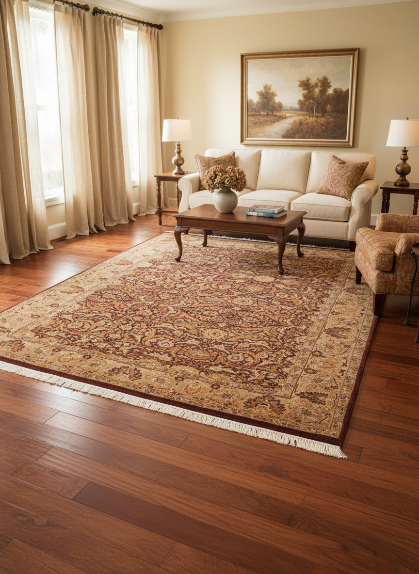 Rug Size: 5'11''X9'0''Material: WoolStyle: Persian, Oriental, Renaissance, Art NouveauColors: Brown Taupe Green GoldWeave Type: Hand Knotted, HandmadePile Height: 0.25 - 0.50 inch