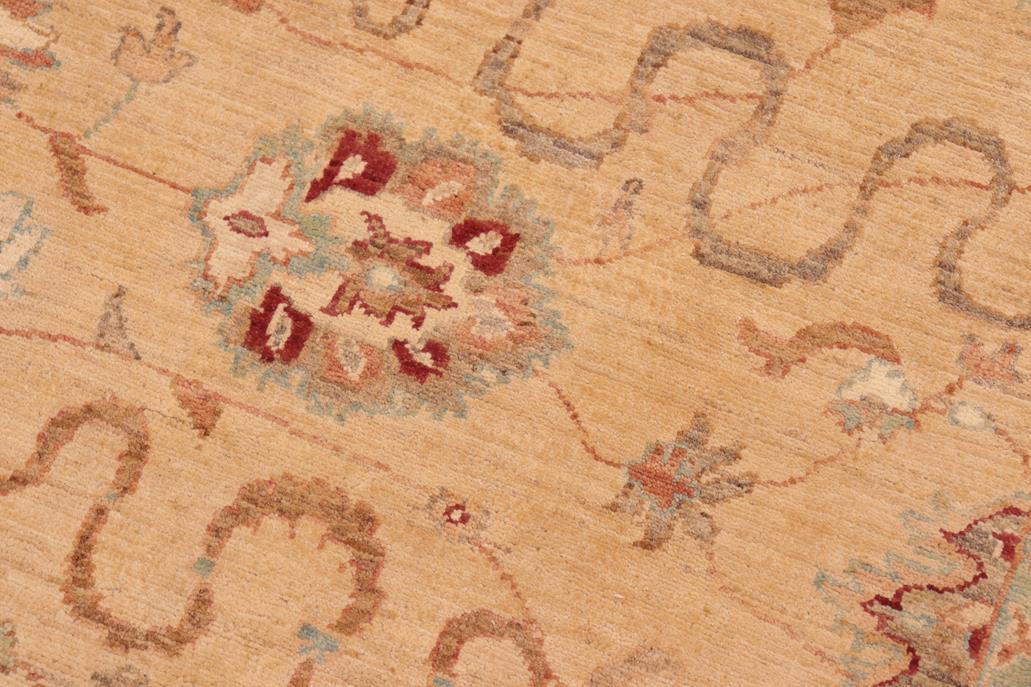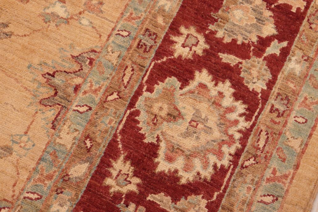 Enhance the ambiance of your home with this magnificent Persian-influenced Turkish hand-knotted rug made by skilled artisans capable of creating the most exceptional vegetable dyes and hand-spun wool. This exquisite handmade rug is a one-of-a-kind Peshawar Kafkaz, otherwise identified as Chobi, Chobi Peshawar, Oushak, or Ziegler rug. These handmade rugs are crafted in Pakistan utilizing superior-quality wool imported from Australia, New Zealand, and Korea in two types of weaves: the Persian weave and the Mori weave. This rug is meticulously crafted by hand using the finest natural vegetable dyes extracted from local plants. The artisans use a blend of hand-spun local and fine merino wool, resulting in a rug with a compelling texture, higher lanolin content, and longer staple. The artisans occasionally incorporate natural or artificial silk into the pile to enhance specific motifs. The finished product is an awe-inspiring flawless design execution and an understated palette that exudes elegance. Contemporary Peshawar rugs draw inspiration from antique Persian designs and feature modern design motifs with vibrant color tones. Hand-knotted with all-natural dyes, resulting in a unique abrash effect and subtle color variations in the pile. Peshawar rugs are known for their stunning and vibrant colors, which were achieved through a process inspired by antique methods. The rug's pile is meticulously trimmed to a moderate thickness and then stone-washed and sun-dried, resulting in a natural sheen and pleasing color tones. Transform the ambiance of your room into a luxurious haven with this gorgeous rug featuring a beautiful color palette. This stunning rug features an intricate oriental design that showcases royalty and seamlessly complements any decor. Its hand-knotted construction and natural fibers provide a soft and comfortable feel underfoot, making it the perfect addition to any room.