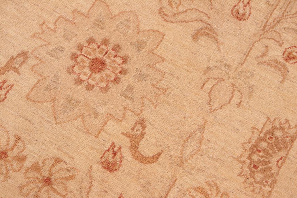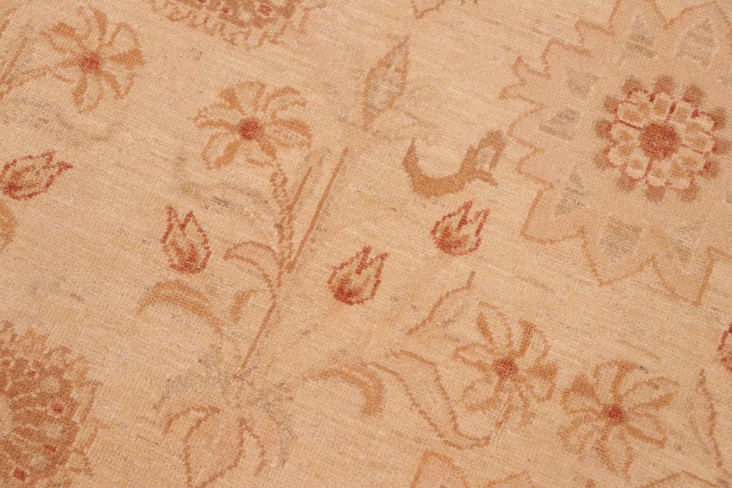 Enhance the ambiance of your home with this magnificent Persian-influenced Turkish hand-knotted rug made by skilled artisans capable of creating the most exceptional vegetable dyes and hand-spun wool. This exquisite handmade rug is a one-of-a-kind Peshawar Kafkaz, otherwise identified as Chobi, Chobi Peshawar, Oushak, or Ziegler rug. These handmade rugs are crafted in Pakistan utilizing superior-quality wool imported from Australia, New Zealand, and Korea in two types of weaves: the Persian weave and the Mori weave. This rug is meticulously crafted by hand using the finest natural vegetable dyes extracted from local plants. The artisans use a blend of hand-spun local and fine merino wool, resulting in a rug with a compelling texture, higher lanolin content, and longer staple. The artisans occasionally incorporate natural or artificial silk into the pile to enhance specific motifs. The finished product is an awe-inspiring flawless design execution and an understated palette that exudes elegance. Contemporary Peshawar rugs draw inspiration from antique Persian designs and feature modern design motifs with vibrant color tones. Hand-knotted with all-natural dyes, resulting in a unique abrash effect and subtle color variations in the pile. Peshawar rugs are known for their stunning and vibrant colors, which were achieved through a process inspired by antique methods. The rug's pile is meticulously trimmed to a moderate thickness and then stone-washed and sun-dried, resulting in a natural sheen and pleasing color tones. Transform the ambiance of your room into a luxurious haven with this gorgeous rug featuring a beautiful color palette. This stunning rug features an intricate oriental design that showcases royalty and seamlessly complements any decor. Its hand-knotted construction and natural fibers provide a soft and comfortable feel underfoot, making it the perfect addition to any room.
