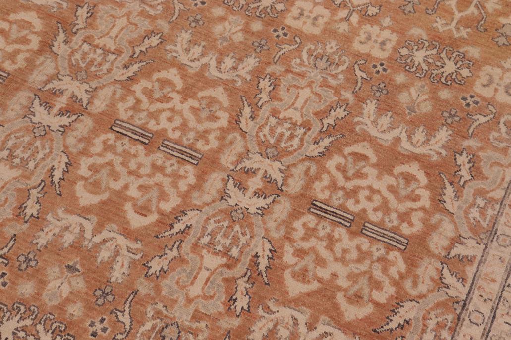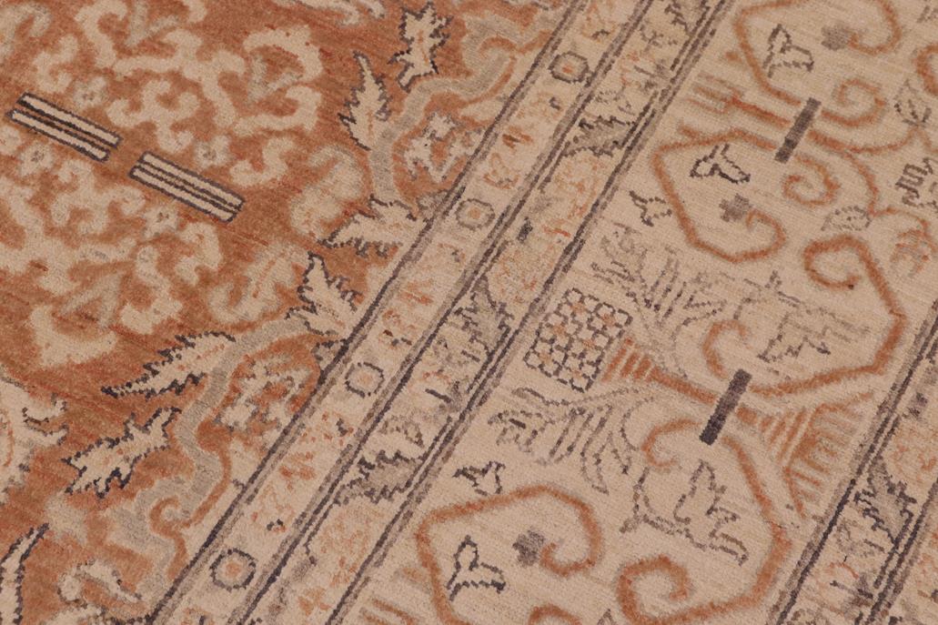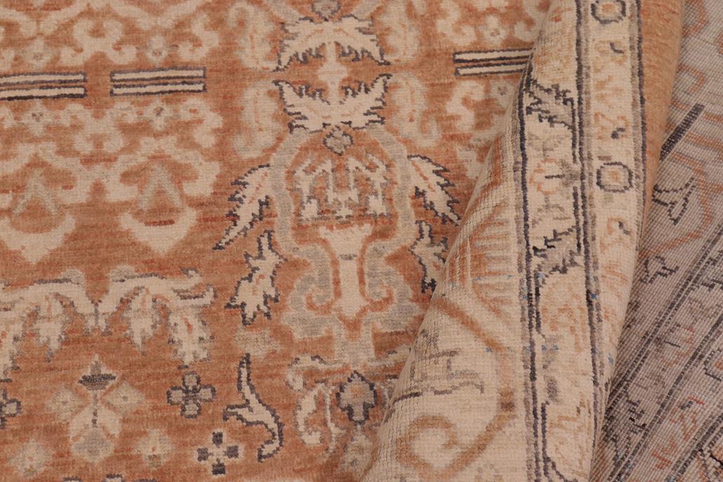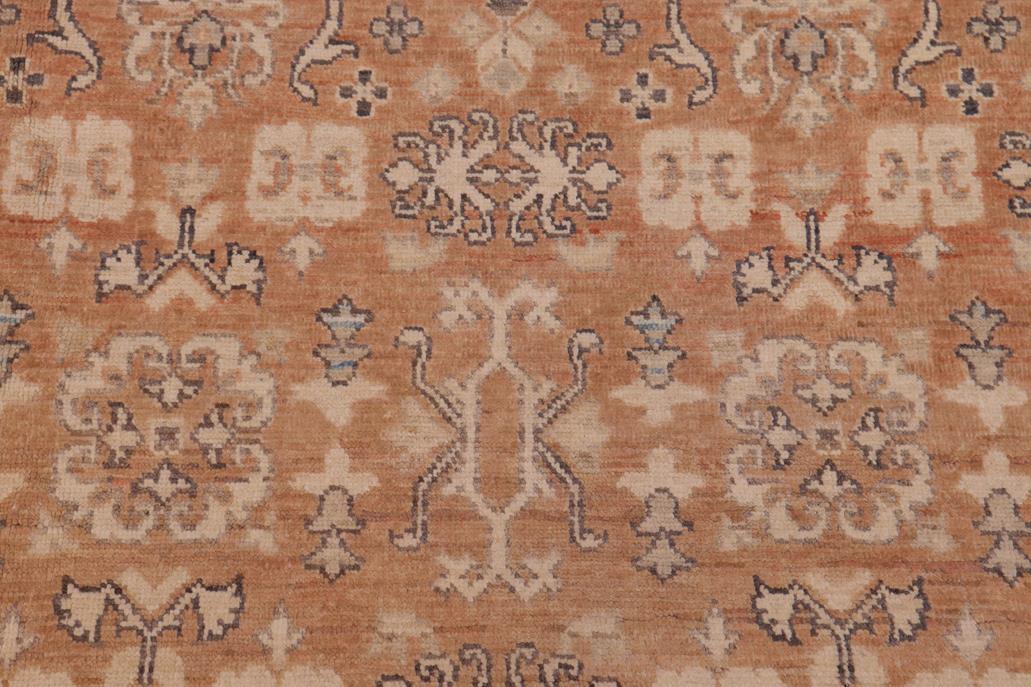 Enhance the ambiance of your home with this magnificent Persian-influenced Turkish hand-knotted rug made by skilled artisans capable of creating the most exceptional vegetable dyes and hand-spun wool. This exquisite handmade rug is a one-of-a-kind Peshawar Kafkaz, otherwise identified as Chobi, Chobi Peshawar, Oushak, or Ziegler rug. These handmade rugs are crafted in Pakistan utilizing superior-quality wool imported from Australia, New Zealand, and Korea in two types of weaves: the Persian weave and the Mori weave. This rug is meticulously crafted by hand using the finest natural vegetable dyes extracted from local plants. The artisans use a blend of hand-spun local and fine merino wool, resulting in a rug with a compelling texture, higher lanolin content, and longer staple. The artisans occasionally incorporate natural or artificial silk into the pile to enhance specific motifs. The finished product is an awe-inspiring flawless design execution and an understated palette that exudes elegance. Contemporary Peshawar rugs draw inspiration from antique Persian designs and feature modern design motifs with vibrant color tones. Hand-knotted with all-natural dyes, resulting in a unique abrash effect and subtle color variations in the pile. Peshawar rugs are known for their stunning and vibrant colors, which were achieved through a process inspired by antique methods. The rug's pile is meticulously trimmed to a moderate thickness and then stone-washed and sun-dried, resulting in a natural sheen and pleasing color tones. Transform the ambiance of your room into a luxurious haven with this gorgeous rug featuring a beautiful color palette. This stunning rug features an intricate oriental design that showcases royalty and seamlessly complements any decor. Its hand-knotted construction and natural fibers provide a soft and comfortable feel underfoot, making it the perfect addition to any room.
