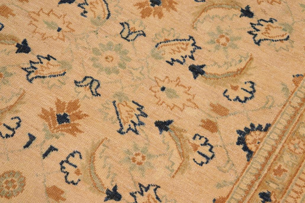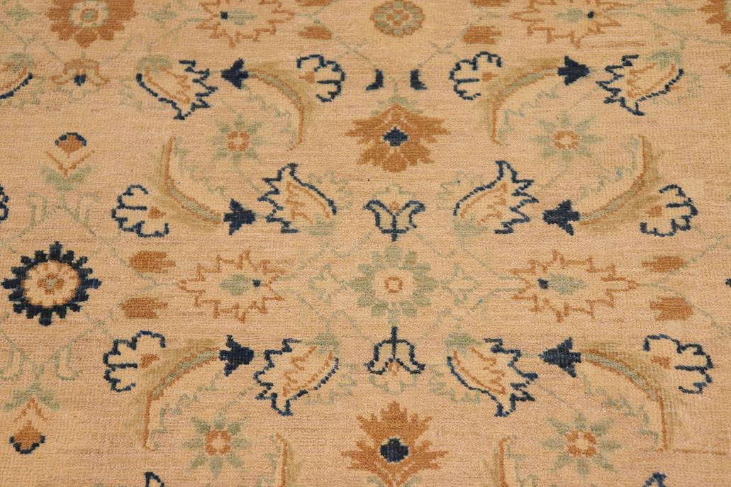 Enhance the ambiance of your home with this magnificent Persian-influenced Turkish hand-knotted rug made by skilled artisans capable of creating the most exceptional vegetable dyes and hand-spun wool. This exquisite handmade rug is a one-of-a-kind Peshawar Kafkaz, otherwise identified as Chobi, Chobi Peshawar, Oushak, or Ziegler rug. These handmade rugs are crafted in Pakistan utilizing superior-quality wool imported from Australia, New Zealand, and Korea in two types of weaves: the Persian weave and the Mori weave. This rug is meticulously crafted by hand using the finest natural vegetable dyes extracted from local plants. The artisans use a blend of hand-spun local and fine merino wool, resulting in a rug with a compelling texture, higher lanolin content, and longer staple. The artisans occasionally incorporate natural or artificial silk into the pile to enhance specific motifs. The finished product is an awe-inspiring flawless design execution and an understated palette that exudes elegance. Contemporary Peshawar rugs draw inspiration from antique Persian designs and feature modern design motifs with vibrant color tones. Hand-knotted with all-natural dyes, resulting in a unique abrash effect and subtle color variations in the pile. Peshawar rugs are known for their stunning and vibrant colors, which were achieved through a process inspired by antique methods. The rug's pile is meticulously trimmed to a moderate thickness and then stone-washed and sun-dried, resulting in a natural sheen and pleasing color tones. Transform the ambiance of your room into a luxurious haven with this gorgeous rug featuring a beautiful color palette. This stunning rug features an intricate oriental design that showcases royalty and seamlessly complements any decor. Its hand-knotted construction and natural fibers provide a soft and comfortable feel underfoot, making it the perfect addition to any room.