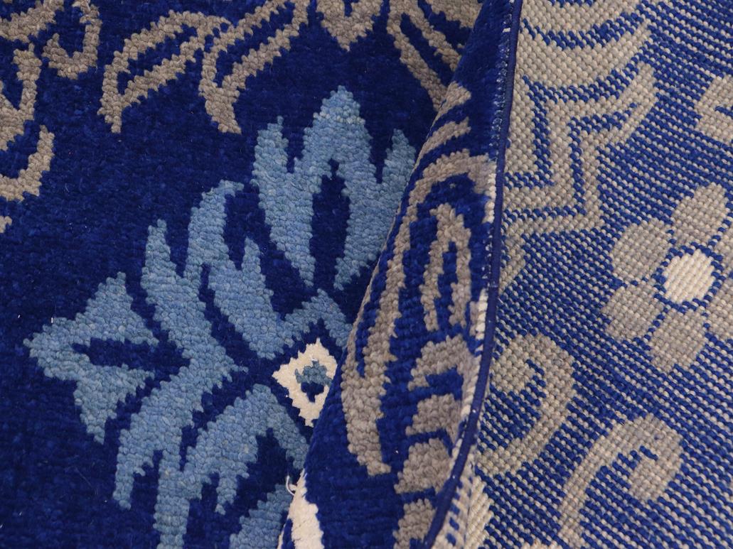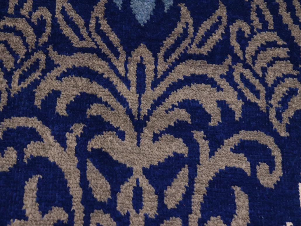 This elegant hand knotted rug features a modern fusion of beauty, with its interlocking geometric and minimalist pattern. This exclusive rug defies the ordinary by fusing art and design with detail and craftsmanship. A repeating intricate pattern of stylized interlocking diamond motif, with two toned colored pallets made with wool and viscous silk, this beautiful handmade rug adds a perfect finishing of elegance and luxurious feel to your decor.