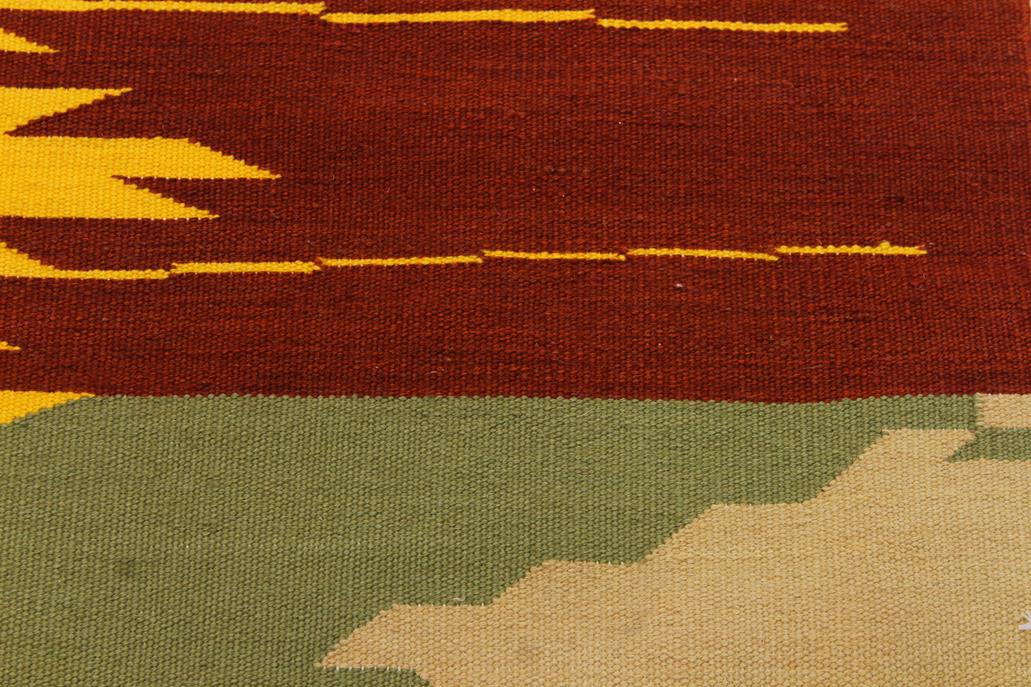 Elevate the elegance of your home with this stunning hand-woven tribal Kilim wool rug. Meticulously crafted on a loom by the Nomad Turkman people using hand-spun wool and 100% natural vegetable dyes, these rugs are recognized for their repetitive geometric patterns, incorporating naturalistic floral and traditional designs. The contemporary fashion palette results in bold, sharp patterns that are incredibly versatile, as the pattern is the same on both sides. These reversible rugs feature a lighter shade on one side and brighter colors on the other, providing versatility according to preference. These unique rugs are made by knotting short strands of different colors onto the warps and securing them by tightly pressing the wefts. The designs are created by interweaving the various colored wefts and warps. Kilims are known for their exceptional durability and versatility, making them truly unique rugs.