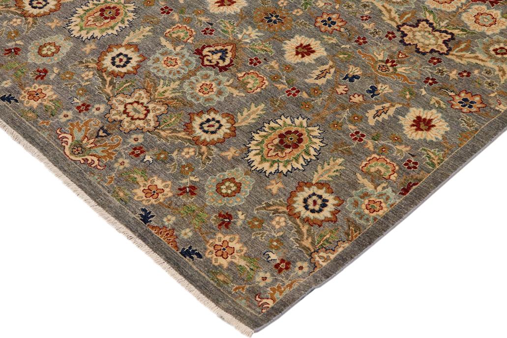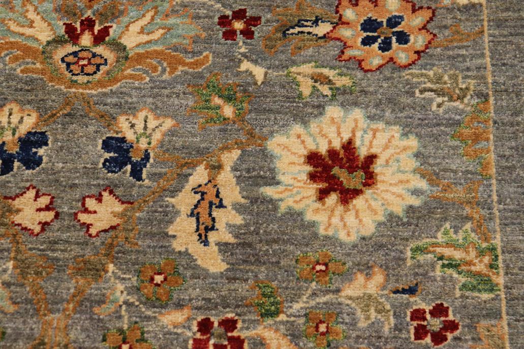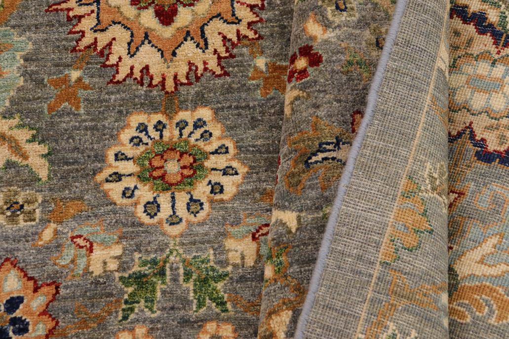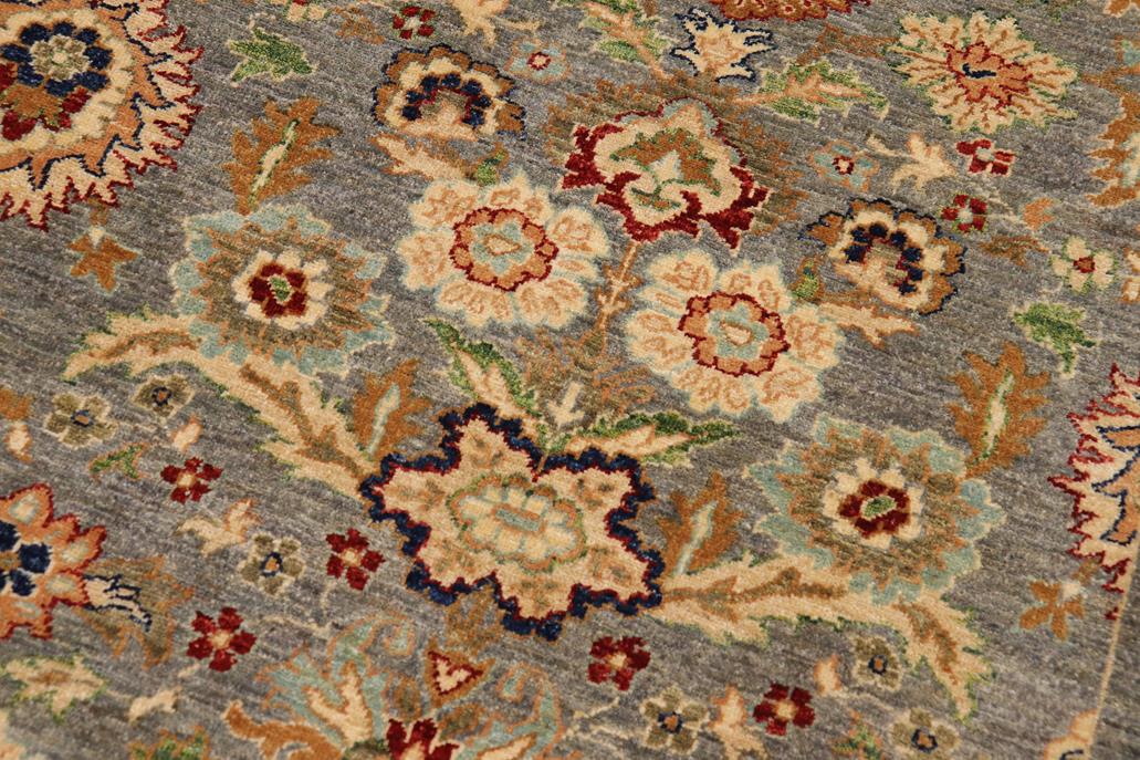 Enhance the ambiance of your home with this magnificent Persian-influenced Turkish hand-knotted rug made by skilled artisans capable of creating the most exceptional vegetable dyes and hand-spun wool. This exquisite handmade rug is a one-of-a-kind Peshawar Kafkaz, otherwise identified as Chobi, Chobi Peshawar, Oushak, or Ziegler rug. These handmade rugs are crafted in Pakistan utilizing superior-quality wool imported from Australia, New Zealand, and Korea in two types of weaves: the Persian weave and the Mori weave. This rug is meticulously crafted by hand using the finest natural vegetable dyes extracted from local plants. The artisans use a blend of hand-spun local and fine merino wool, resulting in a rug with a compelling texture, higher lanolin content, and longer staple. The artisans occasionally incorporate natural or artificial silk into the pile to enhance specific motifs. The finished product is an awe-inspiring flawless design execution and an understated palette that exudes elegance. Contemporary Peshawar rugs draw inspiration from antique Persian designs and feature modern design motifs with vibrant color tones. Hand-knotted with all-natural dyes, resulting in a unique abrash effect and subtle color variations in the pile. Peshawar rugs are known for their stunning and vibrant colors, which were achieved through a process inspired by antique methods. The rug's pile is meticulously trimmed to a moderate thickness and then stone-washed and sun-dried, resulting in a natural sheen and pleasing color tones. Transform the ambiance of your room into a luxurious haven with this gorgeous rug featuring a beautiful color palette. This stunning rug features an intricate oriental design that showcases royalty and seamlessly complements any decor. Its hand-knotted construction and natural fibers provide a soft and comfortable feel underfoot, making it the perfect addition to any room.