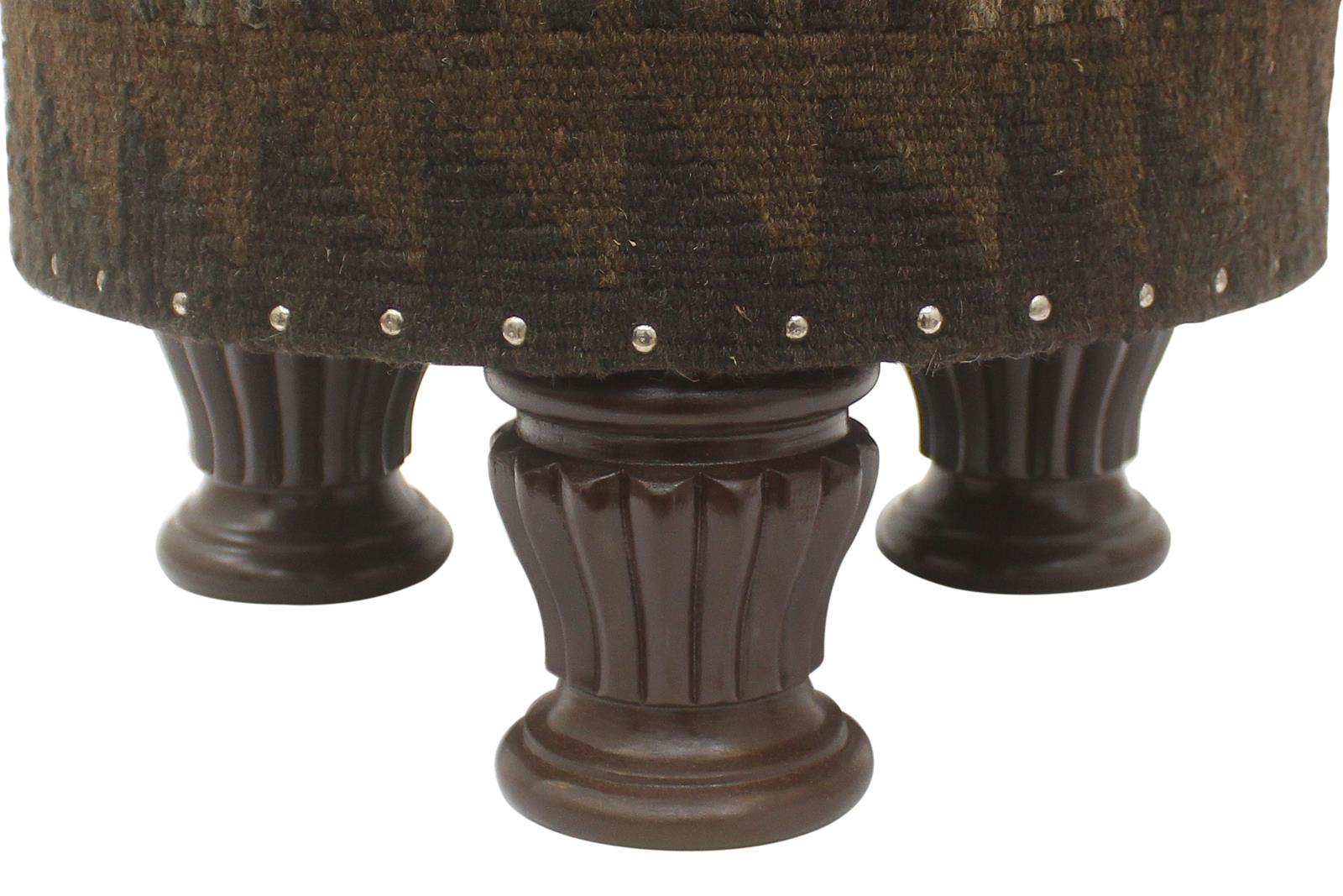 Stylish sophisticated and out of ordinary handmade round ottoman crafted by skilled artisans using vegetable dyed hand-woven Tribal Kilim wool rug and wood is a multi-purpose fashion pouf which will add dimension, color and style to your décor. Inspired by geometric motifs in any array of effervescent color pallet grounds any space with elegance and sophistication.