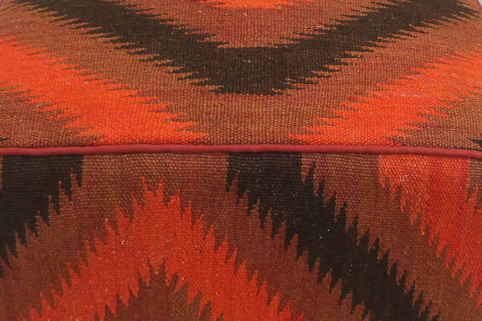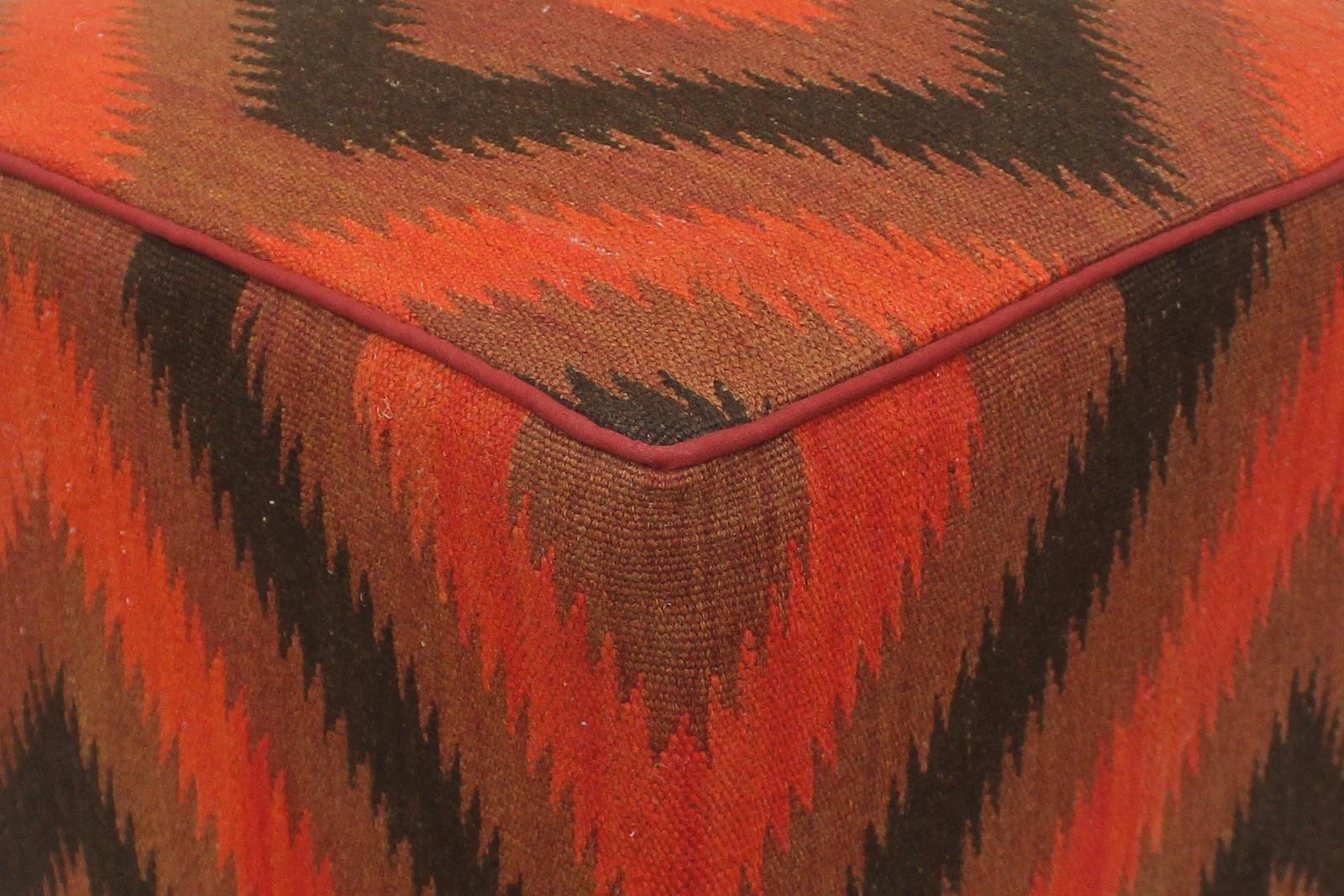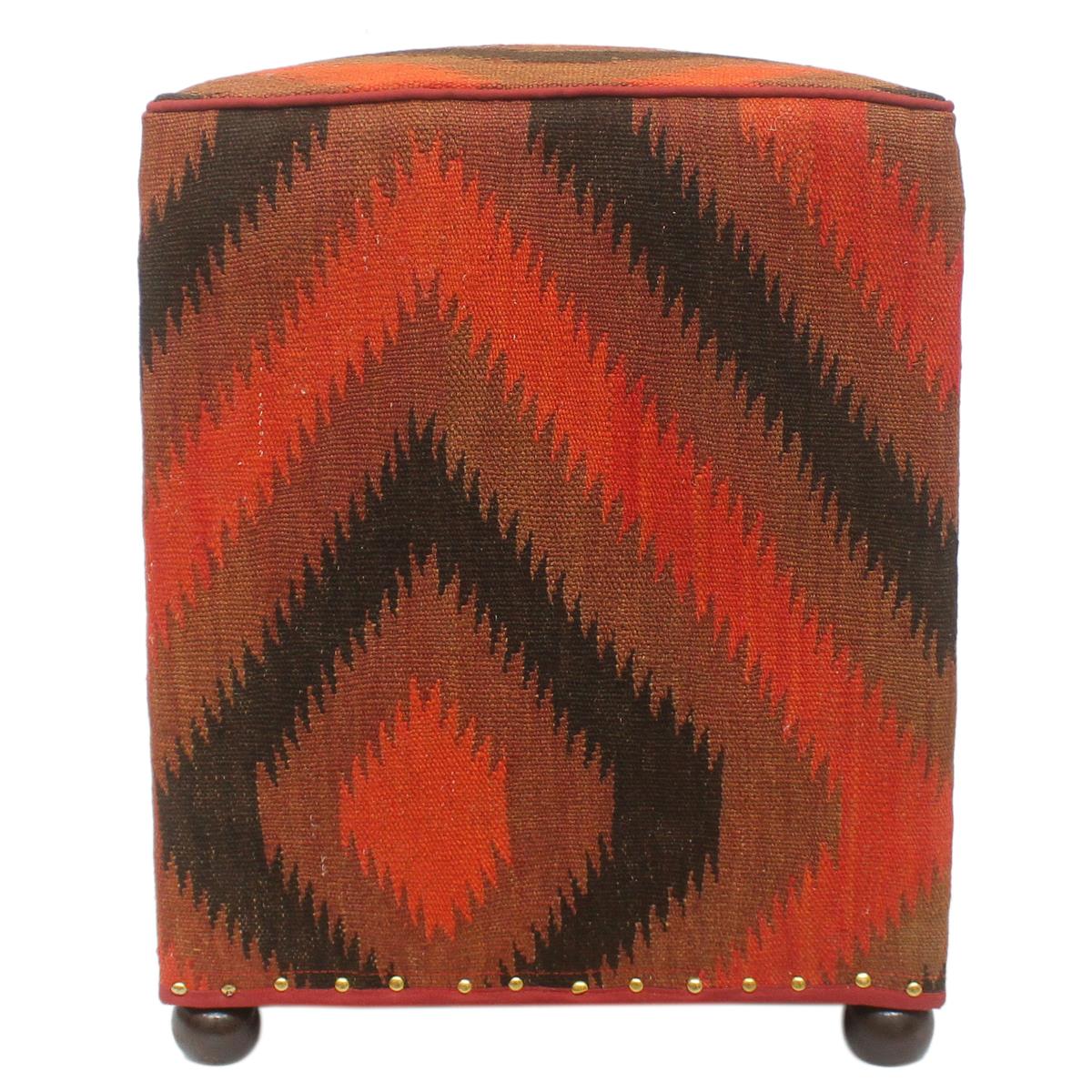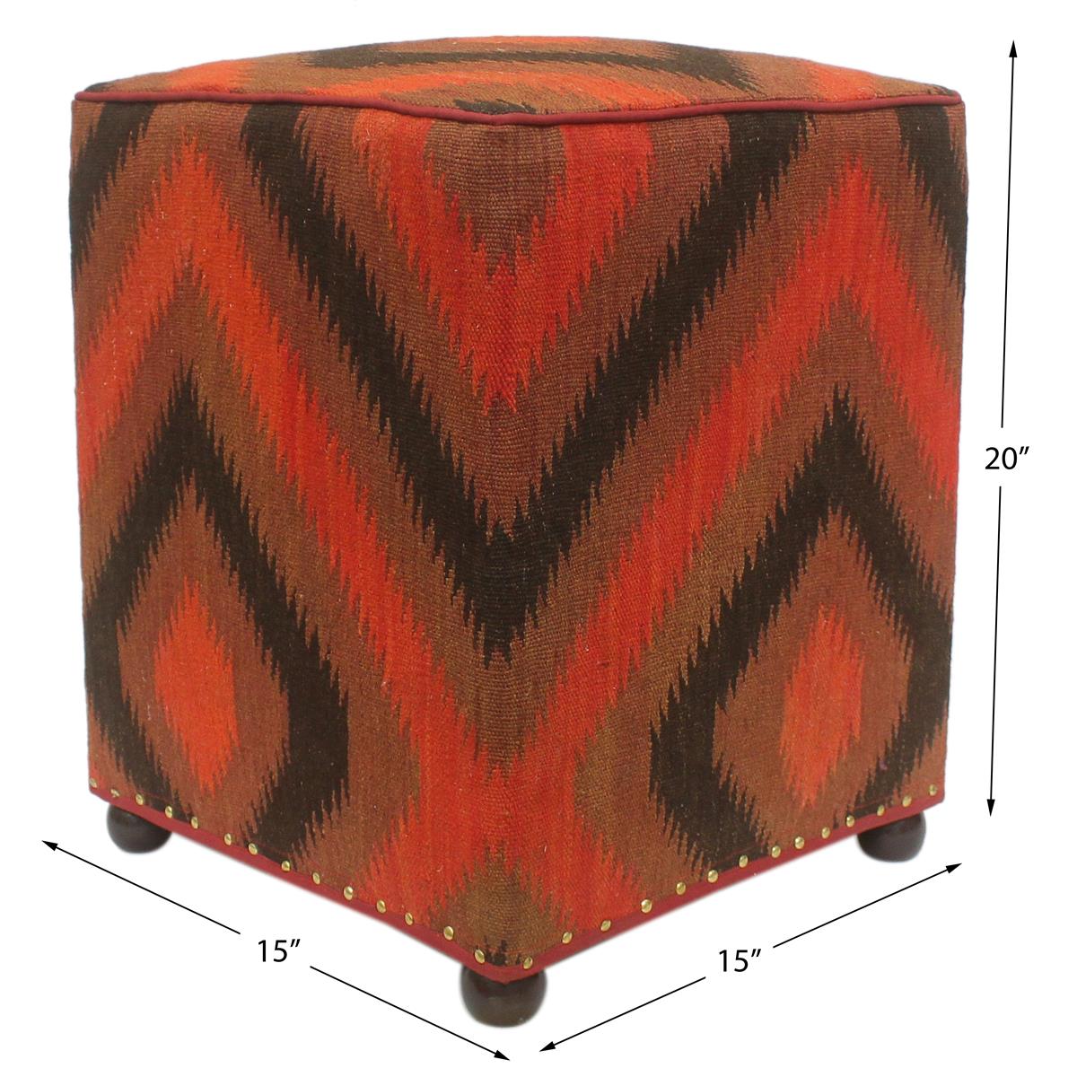 Chic handmade ottoman crafted using wood and upholstered using hand-woven kilim wool rug is a multi-purpose fashion pouf which will add dimension, color and style to your decor. Inspired by geometric motifs in any array of effervescent color pallet grounds any space with elegance and sophistication.