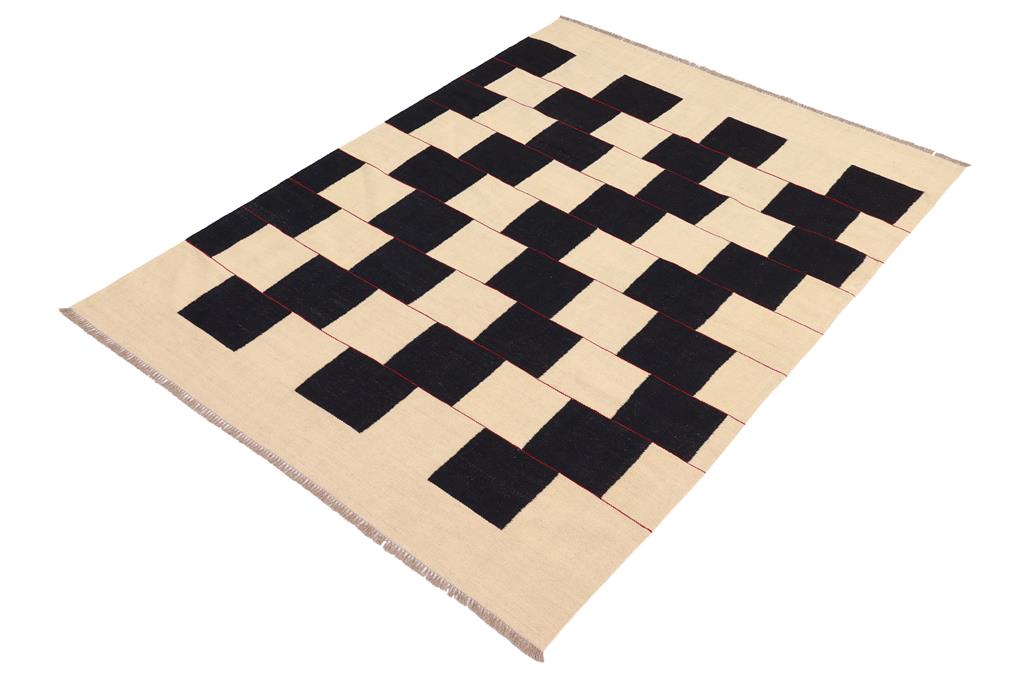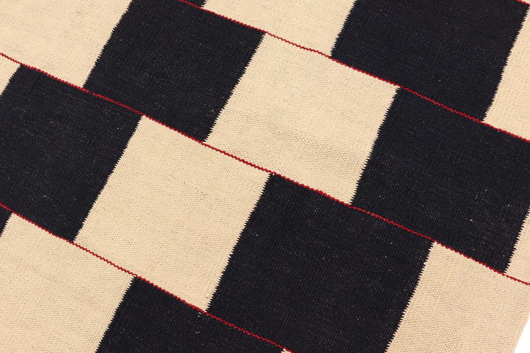 Elevate the elegance of your home with this stunning hand-woven tribal Kilim wool rug. Meticulously crafted on a loom by the Nomad Turkman people using hand-spun wool and 100% natural vegetable dyes, these rugs are recognized for their repetitive geometric patterns, incorporating naturalistic floral and traditional designs. The contemporary fashion palette results in bold, sharp patterns that are incredibly versatile, as the pattern is the same on both sides. These reversible rugs feature a lighter shade on one side and brighter colors on the other, providing versatility according to preference. These unique rugs are made by knotting short strands of different colors onto the warps and securing them by tightly pressing the wefts. The designs are created by interweaving the various colored wefts and warps. Kilims are known for their exceptional durability and versatility, making them truly unique rugs.