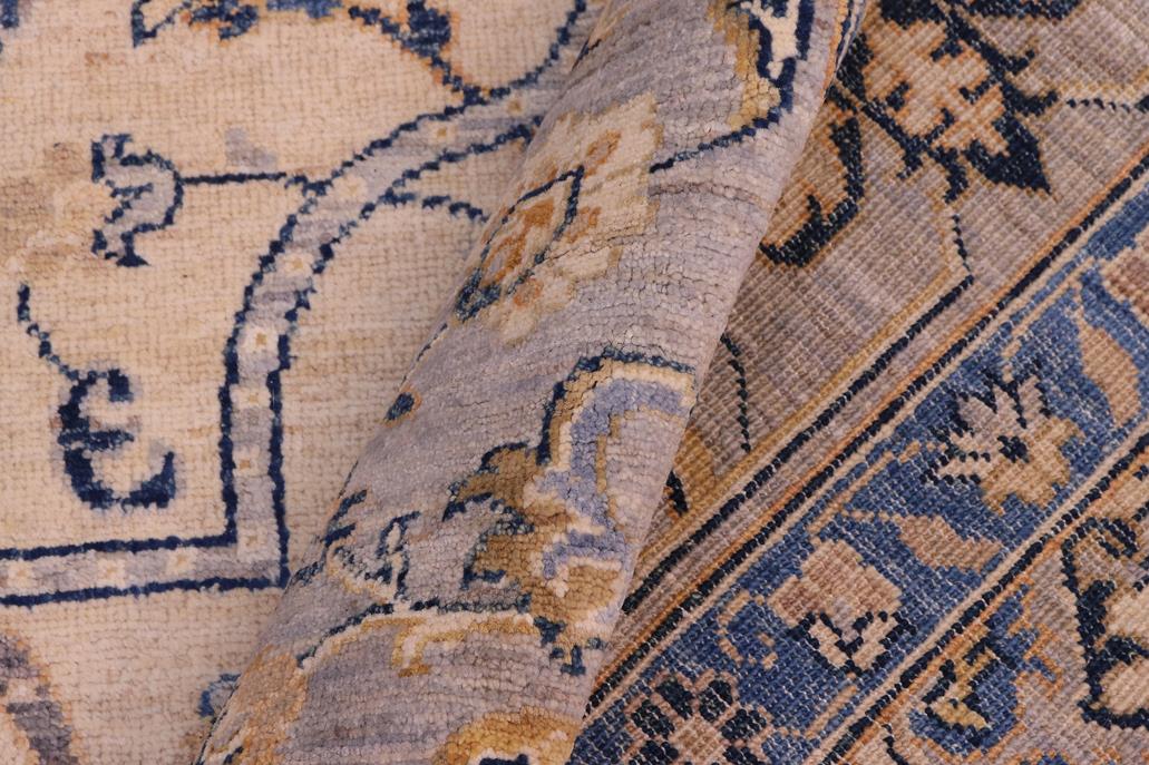 Enhance the ambiance of your home with this magnificent Persian-influenced Turkish hand-knotted rug made by skilled artisans capable of creating the most exceptional vegetable dyes and hand-spun wool. This exquisite handmade rug is a one-of-a-kind Peshawar Kafkaz, otherwise identified as Chobi, Chobi Peshawar, Oushak, or Ziegler rug. These handmade rugs are crafted in Pakistan utilizing superior-quality wool imported from Australia, New Zealand, and Korea in two types of weaves: the Persian weave and the Mori weave. This rug is meticulously crafted by hand using the finest natural vegetable dyes extracted from local plants. The artisans use a blend of hand-spun local and fine merino wool, resulting in a rug with a compelling texture, higher lanolin content, and longer staple. The artisans occasionally incorporate natural or artificial silk into the pile to enhance specific motifs. The finished product is an awe-inspiring execution of flawless design and an understated palette that exudes elegance. Contemporary Peshawar rugs draw inspiration from antique Persian designs and feature modern design motifs with vibrant color tones. Hand-knotted with all-natural dyes, resulting in a unique abrash effect and subtle color variations in the pile. Peshawar rugs are known for their stunning and vibrant colors, achieved through a process inspired by antique methods. The rug's pile is meticulously trimmed to a moderate thickness and then stone-washed and sun-dried, resulting in a natural sheen and pleasing color tones. Transform the ambiance of your room into a luxurious haven with this gorgeous rug featuring a beautiful color palette. This stunning rug features an intricate oriental design that showcases royalty and seamlessly complements any decor. Its hand-knotted construction and natural fibers provide a soft and comfortable feel underfoot, making it the perfect addition to any room.