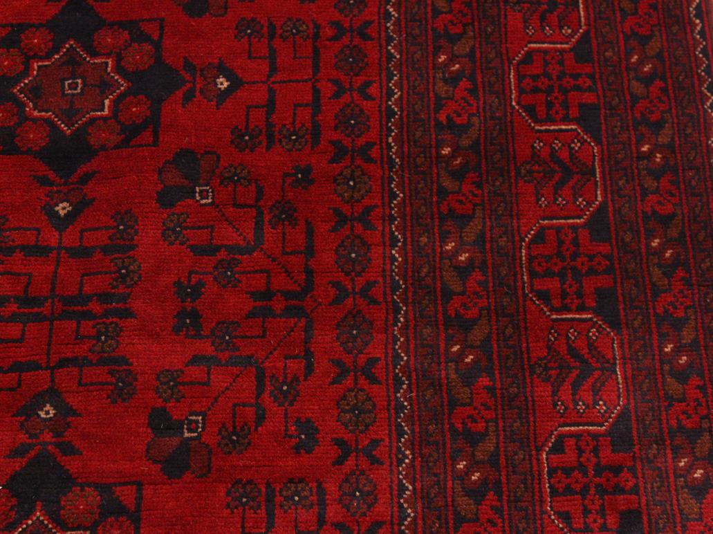 Stunning handmade rug crafted from high quality wool and hand knotted by the Esari Turkmen of Northern Afghanistan. Featuring a geometric pattern, this Biljilk Khal Mohammadi design with dark hues gives this masterpiece a dreamy serenity which adds an undeniable element of luxury to any room in your home.