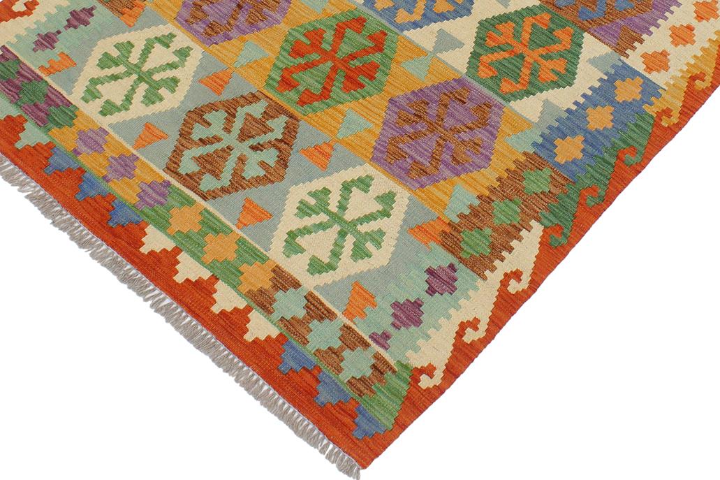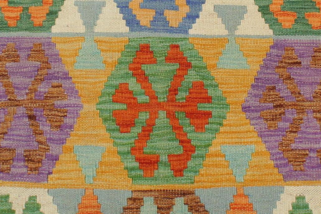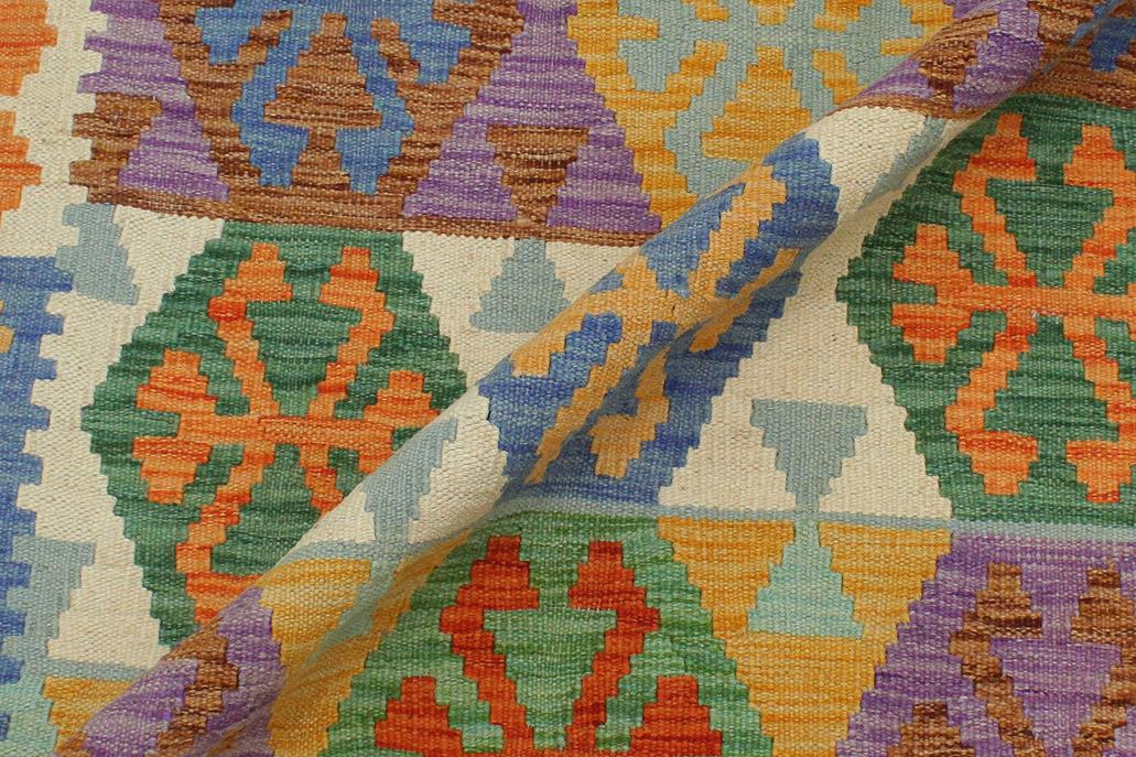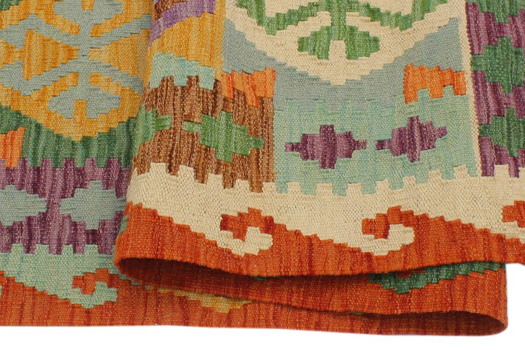 Elevate the elegance of your home with this stunning hand-woven tribal Kilim wool rug. Meticulously crafted on a loom by the Nomad Turkman people using hand-spun wool and 100% natural vegetable dyes, these rugs are recognized for their repetitive geometric patterns, incorporating naturalistic floral and traditional designs. The contemporary fashion palette results in bold, sharp patterns that are incredibly versatile, as the pattern is the same on both sides. These reversible rugs feature a lighter shade on one side and brighter colors on the other, providing versatility according to preference. These unique rugs are made by knotting short strands of different colors onto the warps and securing them by tightly pressing the wefts. The designs are created by interweaving the various colored wefts and warps. Kilims are known for their exceptional durability and versatility, making them truly unique rugs.