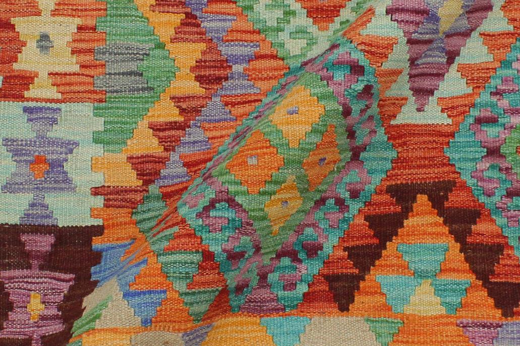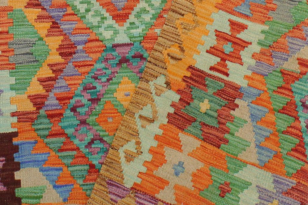 Elevate the elegance of your home with this stunning hand-woven tribal Kilim wool rug. Meticulously crafted on a loom by the Nomad Turkman people using hand-spun wool and 100% natural vegetable dyes, these rugs are recognized for their repetitive geometric patterns, incorporating naturalistic floral and traditional designs. The contemporary fashion palette results in bold, sharp patterns that are incredibly versatile, as the pattern is the same on both sides. These reversible rugs feature a lighter shade on one side and brighter colors on the other, providing versatility according to preference. These unique rugs are made by knotting short strands of different colors onto the warps and securing them by tightly pressing the wefts. The designs are created by interweaving the various colored wefts and warps. Kilims are known for their exceptional durability and versatility, making them truly unique rugs.
