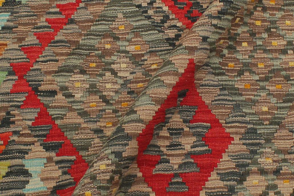Elevate the elegance of your home with this stunning hand-woven tribal Kilim wool rug. Meticulously crafted on a loom by the Nomad Turkman people using hand-spun wool and 100% natural vegetable dyes, these rugs are recognized for their repetitive geometric patterns, incorporating naturalistic floral and traditional designs. The contemporary fashion palette results in bold, sharp patterns that are incredibly versatile, as the pattern is the same on both sides. These reversible rugs feature a lighter shade on one side and brighter colors on the other, providing versatility according to preference. These unique rugs are made by knotting short strands of different colors onto the warps and securing them by tightly pressing the wefts. The designs are created by interweaving the various colored wefts and warps. Kilims are known for their exceptional durability and versatility, making them truly unique rugs.