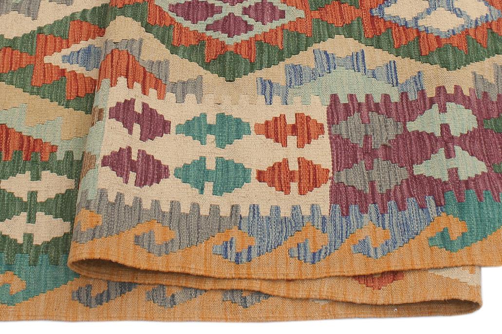 Elevate the elegance of your home with this stunning hand-woven tribal Kilim wool rug. Meticulously crafted on a loom by the Nomad Turkman people using hand-spun wool and 100% natural vegetable dyes, these rugs are recognized for their repetitive geometric patterns, incorporating naturalistic floral and traditional designs. The contemporary fashion palette results in bold, sharp patterns that are incredibly versatile, as the pattern is the same on both sides. These reversible rugs feature a lighter shade on one side and brighter colors on the other, providing versatility according to preference. These unique rugs are made by knotting short strands of different colors onto the warps and securing them by tightly pressing the wefts. The designs are created by interweaving the various colored wefts and warps. Kilims are known for their exceptional durability and versatility, making them truly unique rugs.